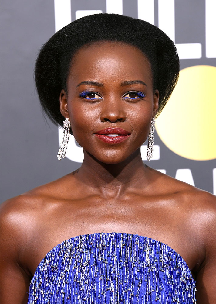 Blue liner and blue mascara were the winning combo that the Black Panther star wore to match her bejeweled gown.