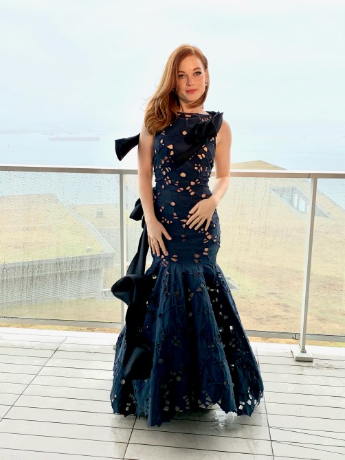 Her makeup was done by Molly Stern. She prepped her client’s face with the Pause Well-Aging Fascia Stimulating Tool and applied Armani Beauty makeup.