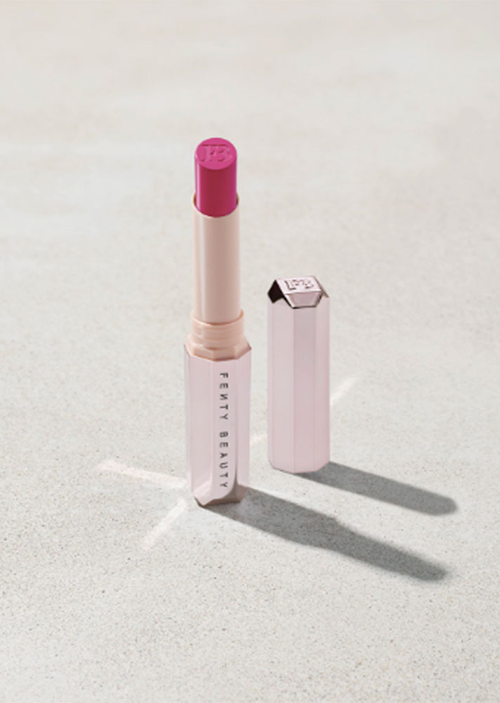 One of the newest lippie shades in Rihanna’s line is this electric berry pink.
