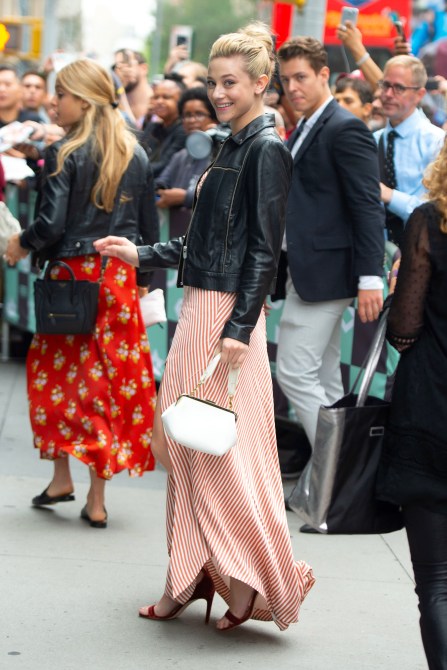 Also on Monday, Lili Reinhart headed to an event sporting the same color scheme in a very different way. She donned an orange and white maxi dress, sienna velvet heels and a black leather jacket—topping off her look with a small white bag.