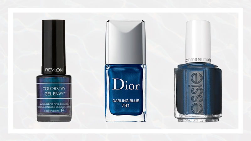 Dark Blue: Spotted at shows such as Costello Tagliapetra and Karen Walker, jewel tone blues will be a go-to as the weather cools down. To get that hint of metallic that we all love, Fleury recommends Revlon Color Stay Gel Envy in All In because it gives a “disco in an opium den vibe.” She warns though, always stick to dark, sparkly finishes when choosing metallic blue polishes, otherwise you can veer into bad ’80s territory. (L to R: Revlon Color Stay Gel Envy All In, $5; Dior Darling Blue, $27; Essie Spun in Luxe, $8)