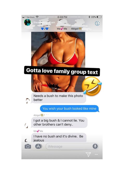 It started with her husband, Justin Ervin, who sent a photo from the shoot with drawn-on black pubic hair adding, “Needs a bush to make this photo better!” Graham quickly chimed in with, “You wish your bush looked like mine” followed by sister, Abigail, remixing Sir Mix A Lot’s “Baby Got Back” with, “I gotta big bush & I cannot lie. You other brothers can’t deny…”.