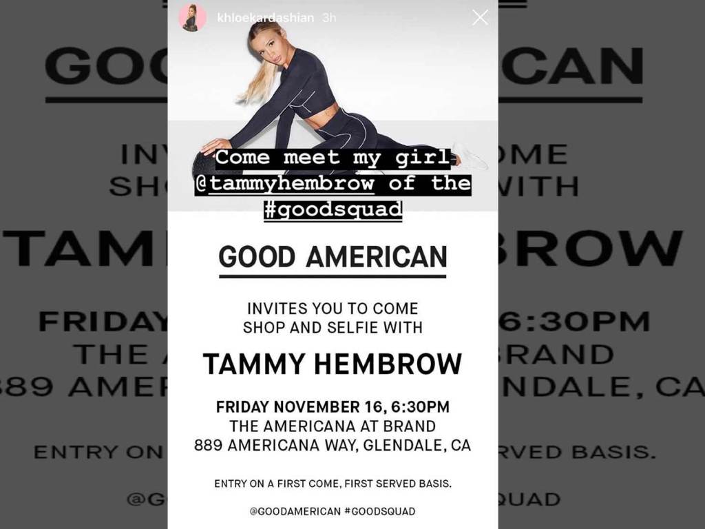 The 24-year-old is also a model for Khloé Kardashian’s Good American fashion label. Kardashian shared a photo of Tammy wearing her Good American activewear in early November 2018 with the caption, “Come meet my girl @tammyhembrow of the #goodsquad.”