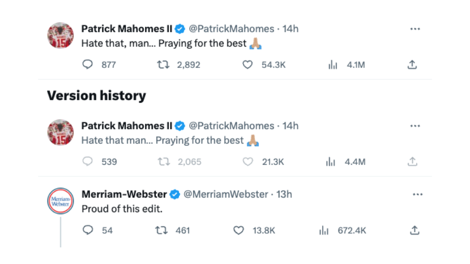 After what we can only assume was some negative feedback, Mahomes edited his tweet (which apparently you can only do if you have a blue authentication tick, smh) to read: “Hate that, man… praying for the best,” demonstrating how much heavy lifting that comma is doing. Fans found the whole thing hilarious, even the Merriam-Webster dictionary social media account responded: “Proud of this edit.”