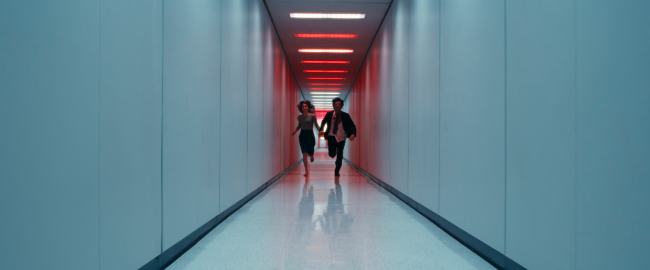 Mr. Milchik acts as the drum major with his large conducting stick and the overhead lights flash in different colors a la the Music Dance Experience that we see in Season 1. Innie Mark and Helly R. see it as a perfect opportunity to distract Milchek so that Mark can find Gemma in the Testing Floor, whose life was in danger after he completed Cold Harbor. Helly steals Milchek’s radio and locks him in the bathroom. She blocks the bathroom door but struggles to keep him in, when all of a sudden Dylan barricades the door with one of Lumon’s vending machines.
