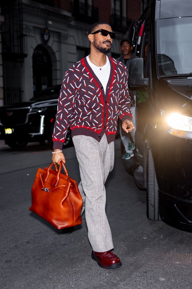 Before we get into the bag, let’s talk about the outfit that came with it. Jordan, who’s known for excelling in the fashion department, wore a simple white T-shirt beneath a red-and-brown patterned cardigan—perfect for easing into spring. He paired it with loose yet tailored trousers and topped off the look with burgundy shoes. Accessories included a David Yurman bracelet and black sunnies.