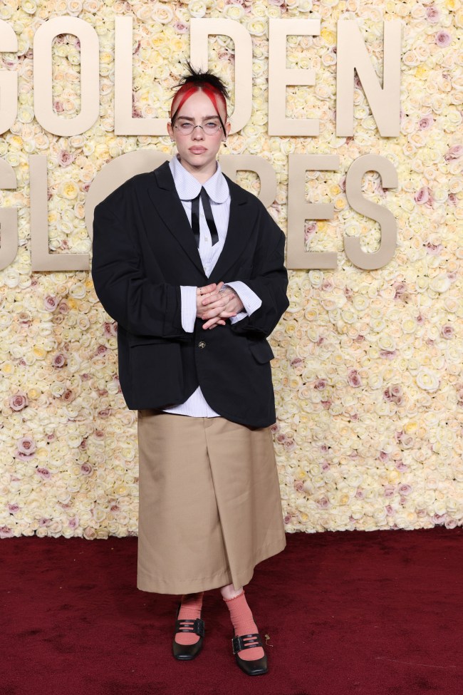 Who but Billie could pull that together? Her two-toned, red-and-black hair is the perfect addition, as are her cute glasses. FWIW, her brother and writing partner Finneas is in all Armani.