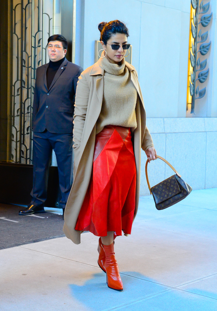 The top half of Chopra’s look—the turtleneck and trench—came in the same shade of camel. And the bottom half—the leather skirt and leather booties—were rendered in a saturated red. In other words, Chopra coordinated the top half of her outfit and the bottom half of her outfit, but she didn’t match from head-to-toe.