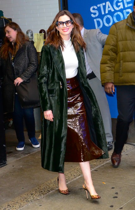 Later that day, Hathaway left the Good Morning America studio in a totally different ensemble. (She’s like the revolving door of cute winter outfits.) This look gave me total The Matrix vibes. The dark chocolate-cherry leather skirt, long green trench and newly added sunnies—the sun had come up at this point—kept Anne Hathaway looking incredibly chic. Plus, the animal print heels she wore elevated the entire ensemble by adding a some subtle pattern. Someone please get me her stylist.
