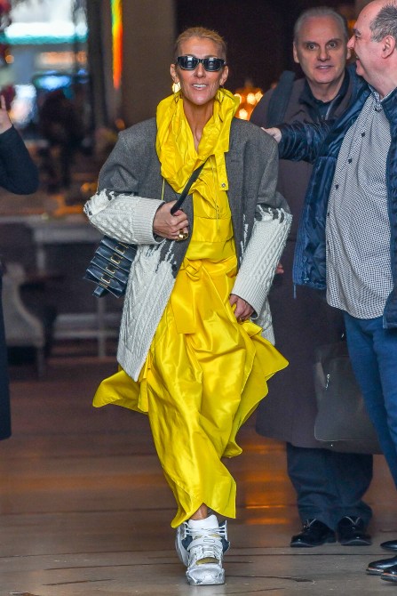 Like, actually, I think I screamed “Celine! What are you wearing?!” to my computer when I saw this bold ensemble. Let’s start with the dress, because it actually might keep me up at night if I don’t address this. The singer was seen in Paris wearing a neon yellow dress that made her look like a walking couture crayon. The fabric, which looks to me like polyester, gave the dress a floor-length raincoat vibe. IDK what the hell is going on, but did Celine Dion just join the cast of Sesame Street? Because that’s truly the only explanation I can think of that makes any sense.