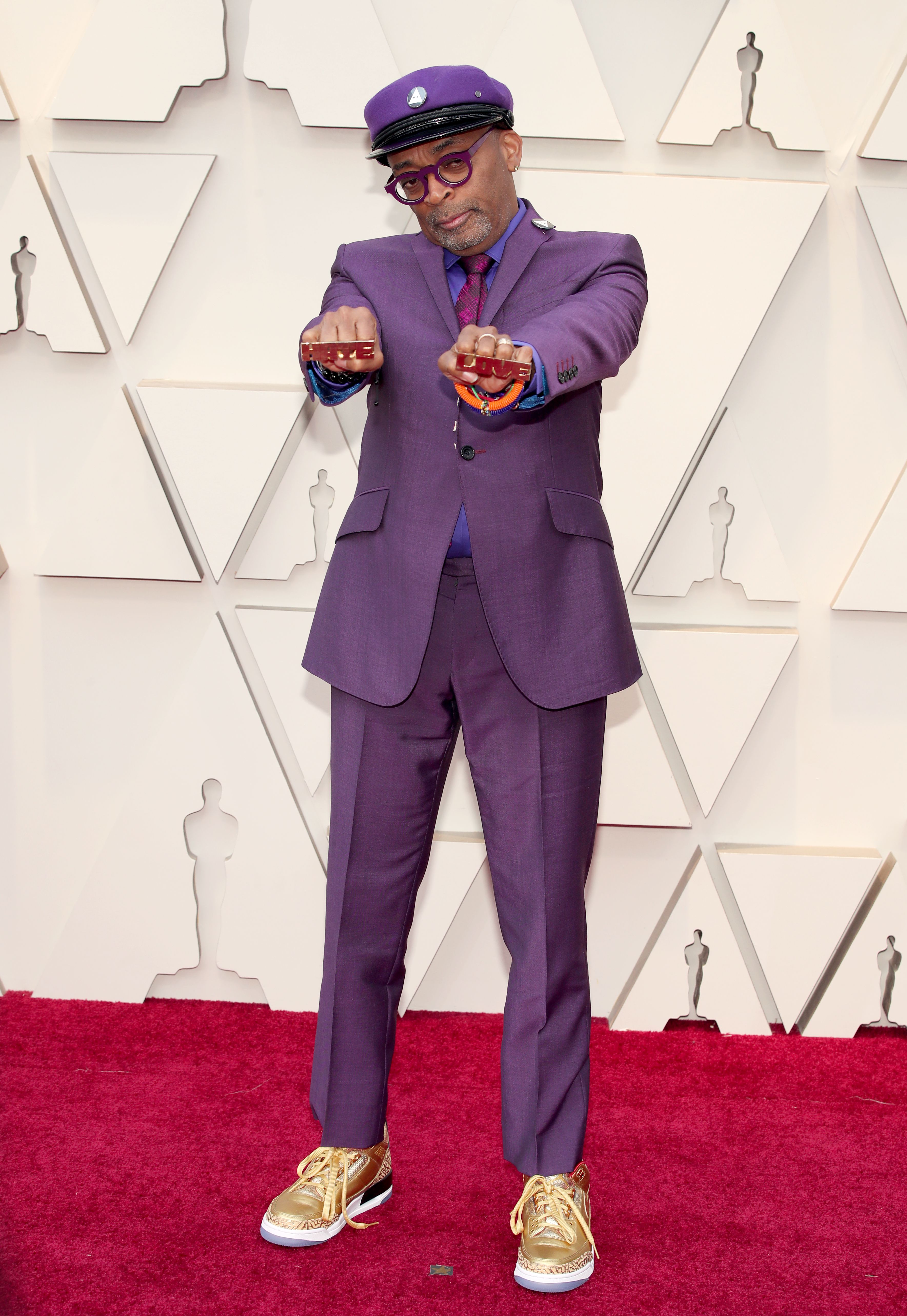 Spike Lee in a purple suit with matching purple hat, gold sneakers and rings that say “HATE” and “LOVE” might be the new gold standard for men’s red carpet looks.