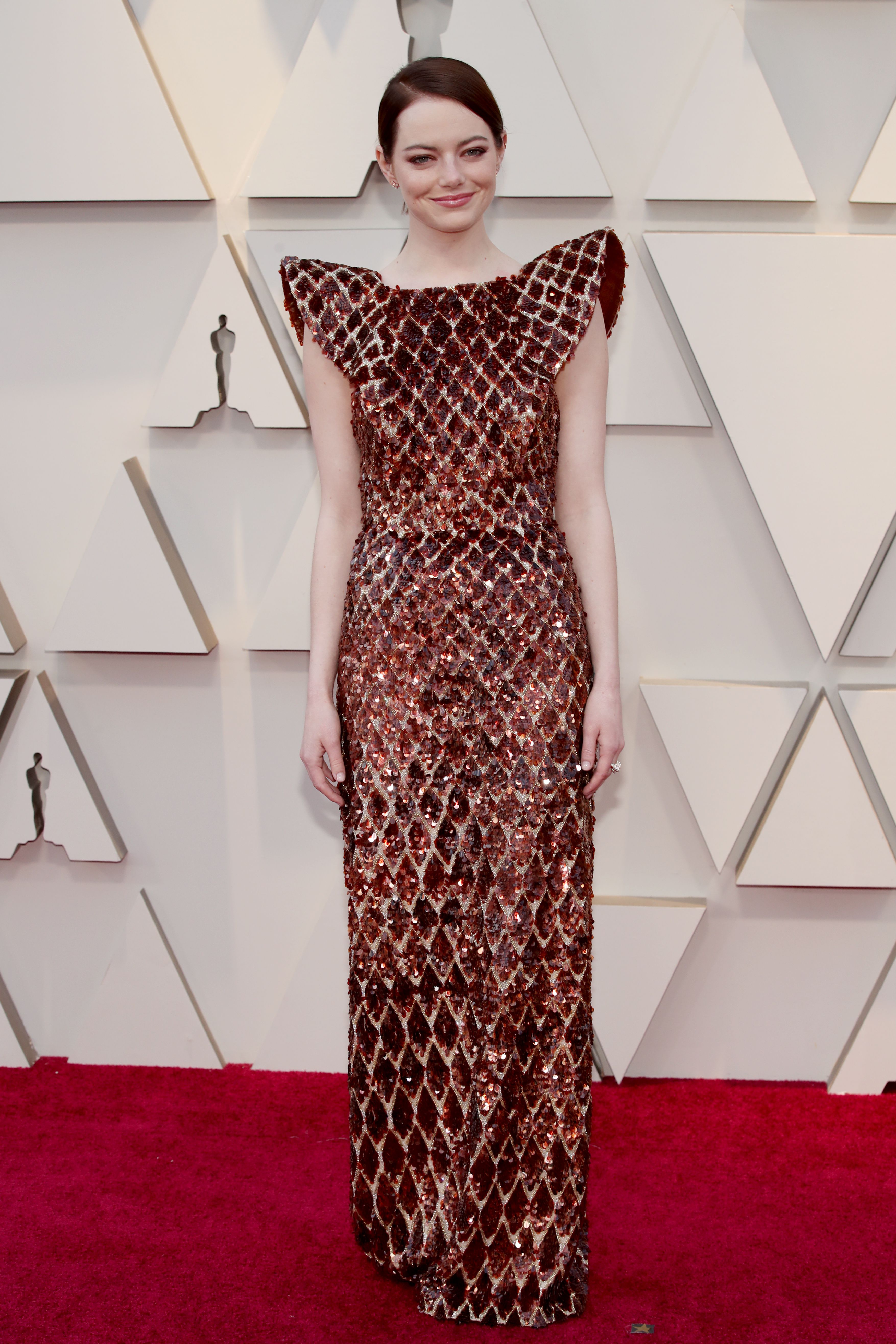 Emma Stone has become the poster child for the phrase “can’t stop; won’t stop.” Seriously, the actress can’t stop landing incredible roles or managing to pick the perfect ensembles to complement her red hair. And Emma Stone’s 2019 Oscars look only puts her higher on the pedestal. After wearing a beautiful gold gown in 2017 and a sleek red and pink suit in 2018 we weren’t sure in which direction Stone would go. But The Favourite actress arrived to the 2019 Academy Awards wearing a sequin dress so chic, I think the entire ensemble deserves an Oscar.