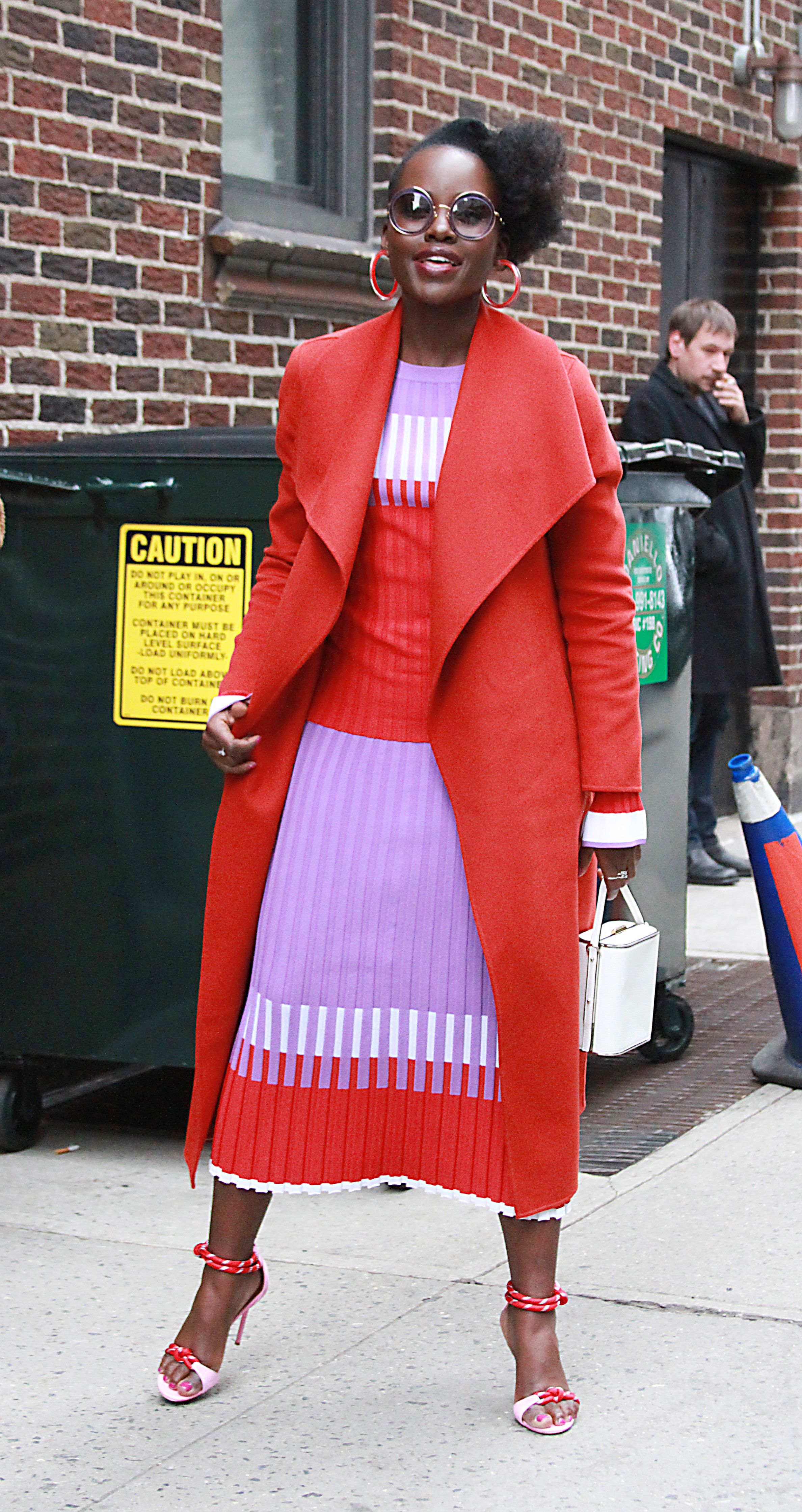 The actress practically embodied a sunny day as she arrived at The Late Show studio wearing a Prabal Gurung ensemble.The outfit featured a red, white and purple midi dress—think ultra-chic grandma vibes—and a flawless red overcoat. Nyong’o managed to emit total spring vibes even while facing the chilly NYC weather. (Spring coats really are a thing, and Lupita Nyong’o just proved it.)