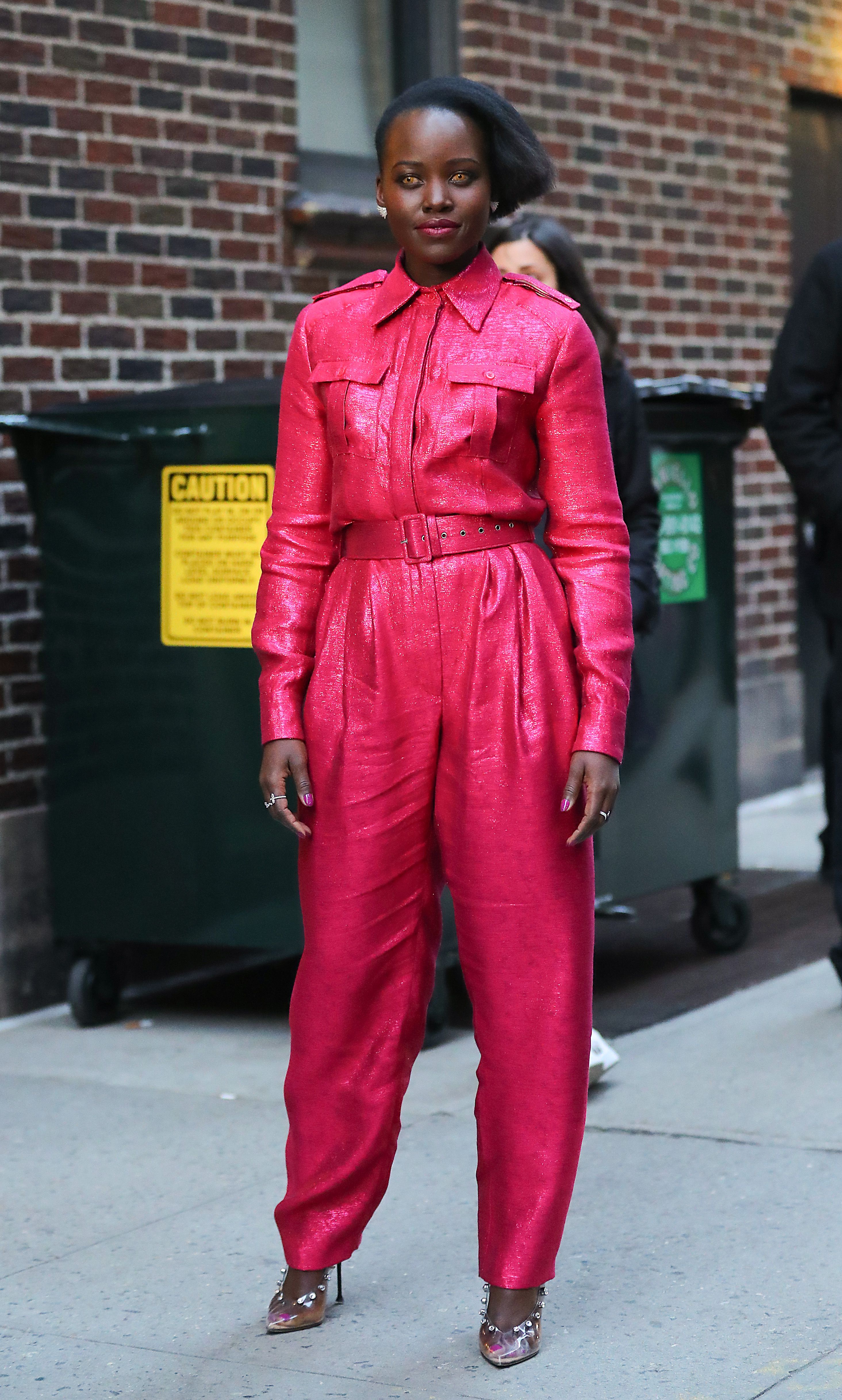 Nyong’o, promoting her new horror movie Us, decided to not only change her look for the filming of The Late Show, but also her eye color. In addition to the effortlessly chic pink jumpsuit and translucent (but also embellished!!) heels, Nyong’o sported gold contacts in homage to one of her creepy characters in the film. I’m a little scared, but it’s mostly because of how obsessed I am with the hot pink jumpsuit—and every single outfit Lupita Nyong’o wears. I never want these promotional interviews to end!