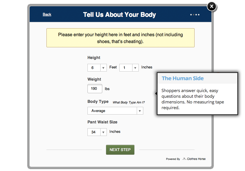 Basically, it’s a tool that will be on over 600 e-commerce sites that allows shoppers to click on a “What size am I?” button. From there,  you’ll be brought to a quick (and we really mean quick! It takes about 20 seconds!) pop-out Clothes Horse survey with basic  questions about your size. The pop-out will then do it’s job to calculate the perfect size for you in a specific brand, instead of you having to consult a generic size chart.