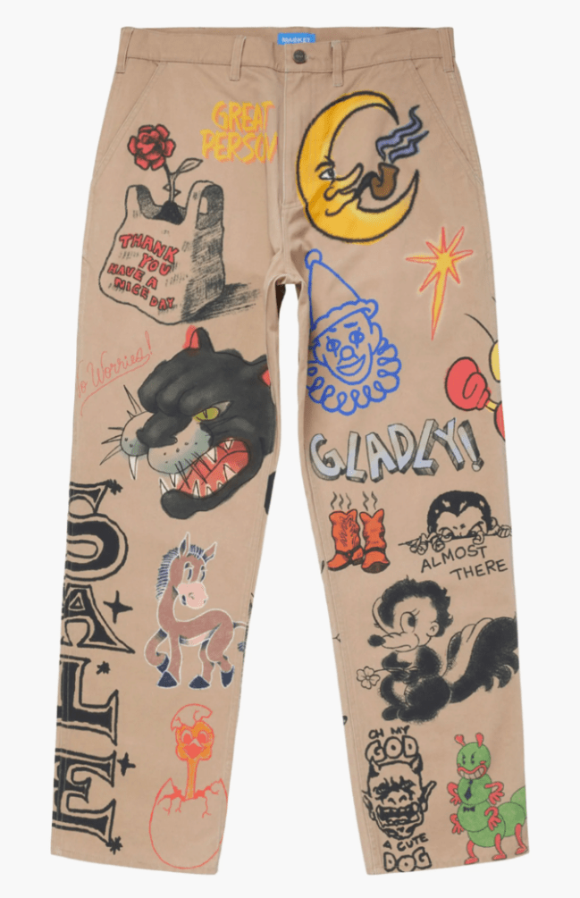 The brand MARKET makes a whole line of fun pants. This pair looks as if an artist used the canvas pants as a personal doodle page.