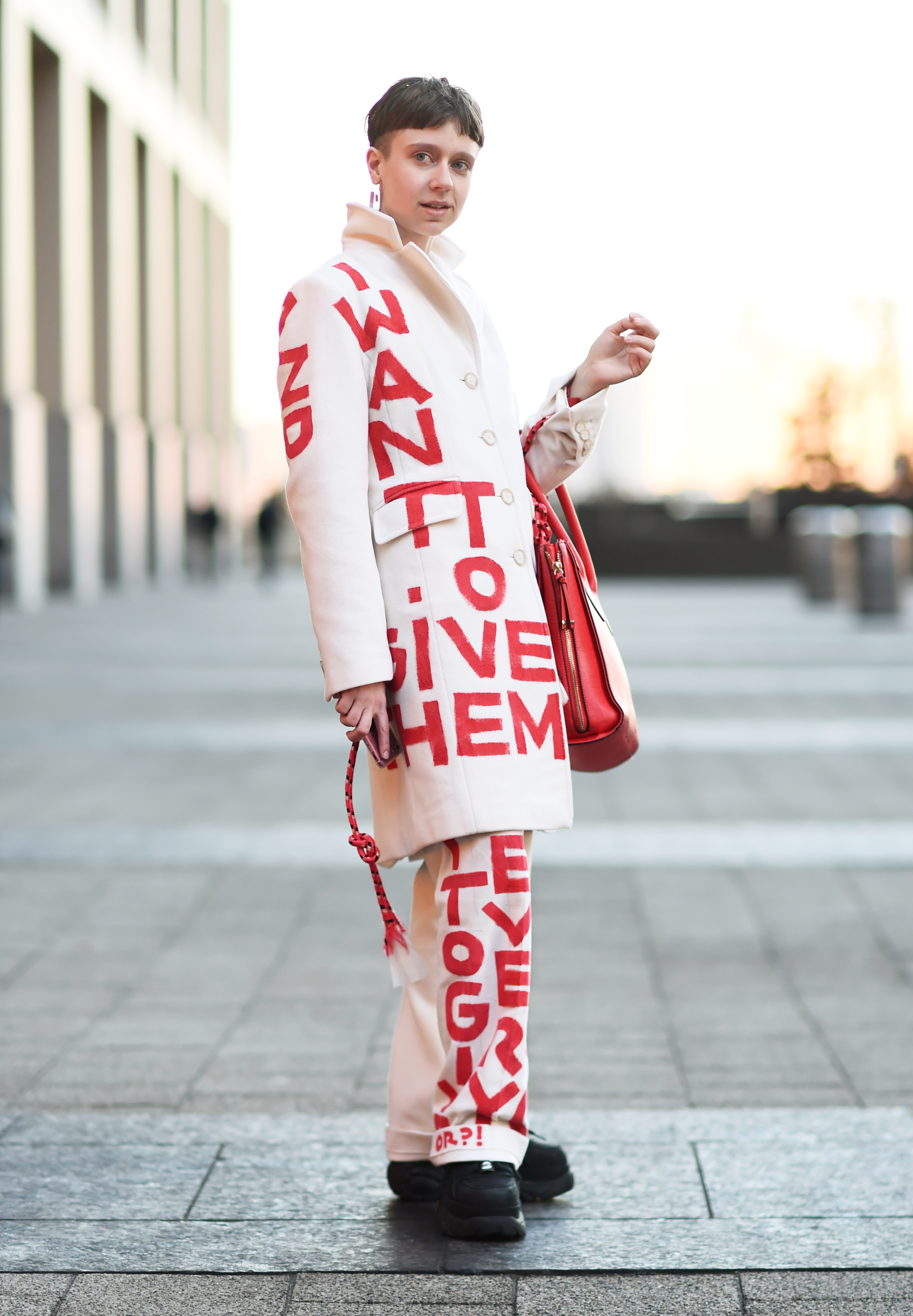 A guest is seen wearing a white Official Rebrand outfit outside the Tanaka show during New York Fashion Week: Men’s Fall/Winter 2019.