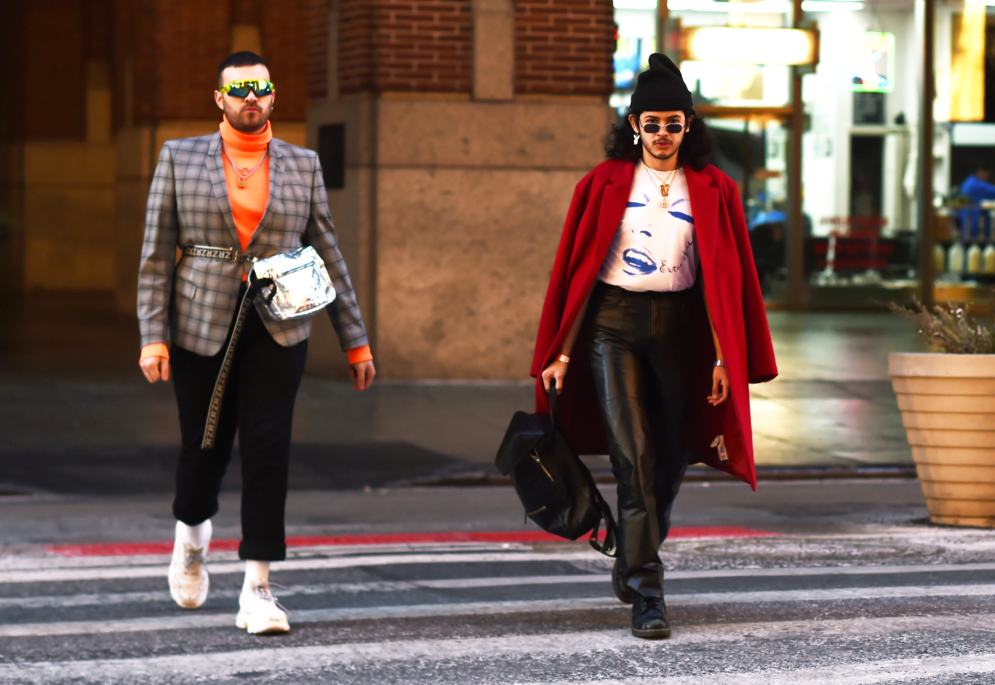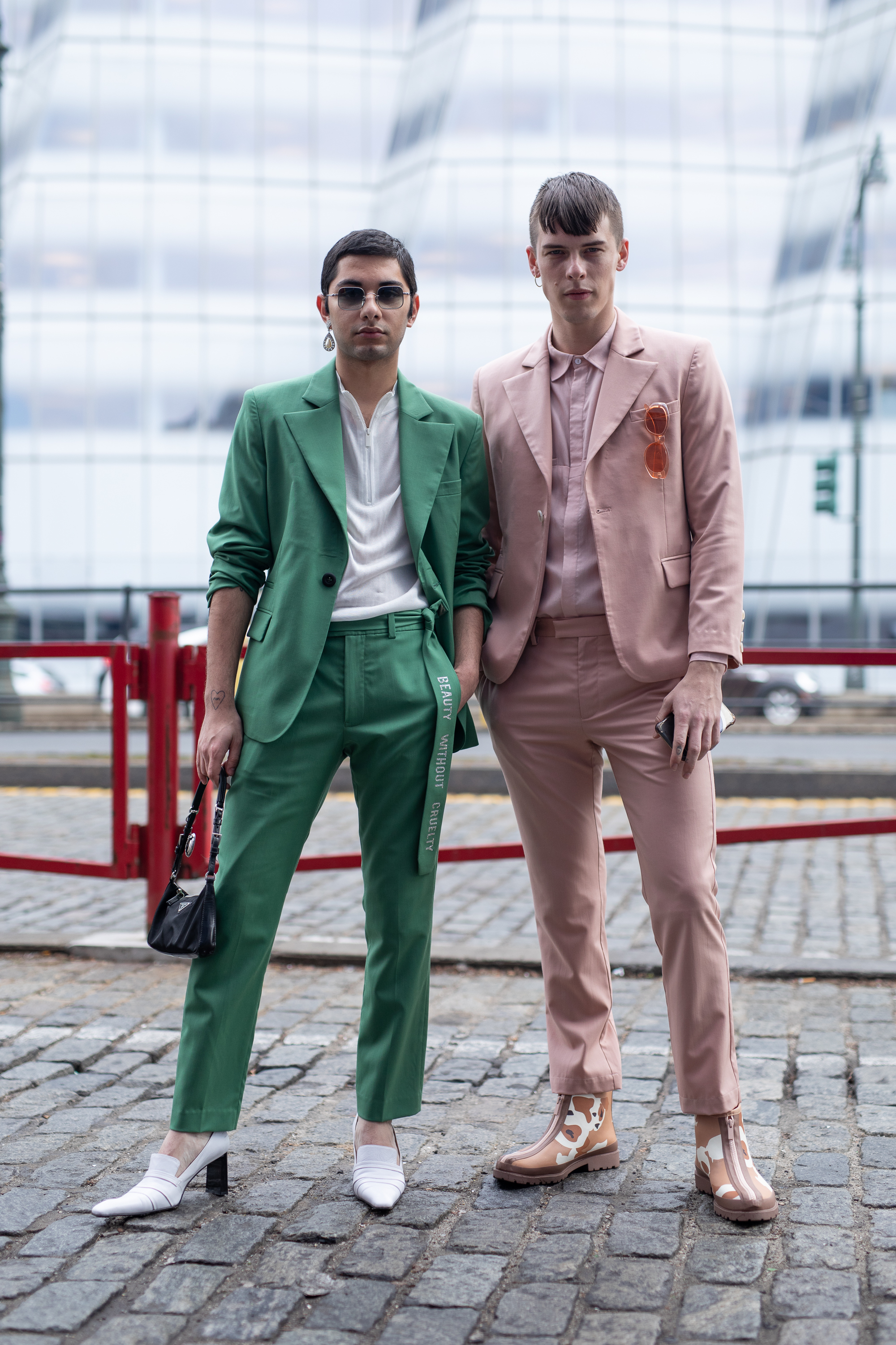 Two guests are seen on the street wearing a green suit and white heels and a pink suit with printed booties during Men’s New York Fashion Week in New York City.