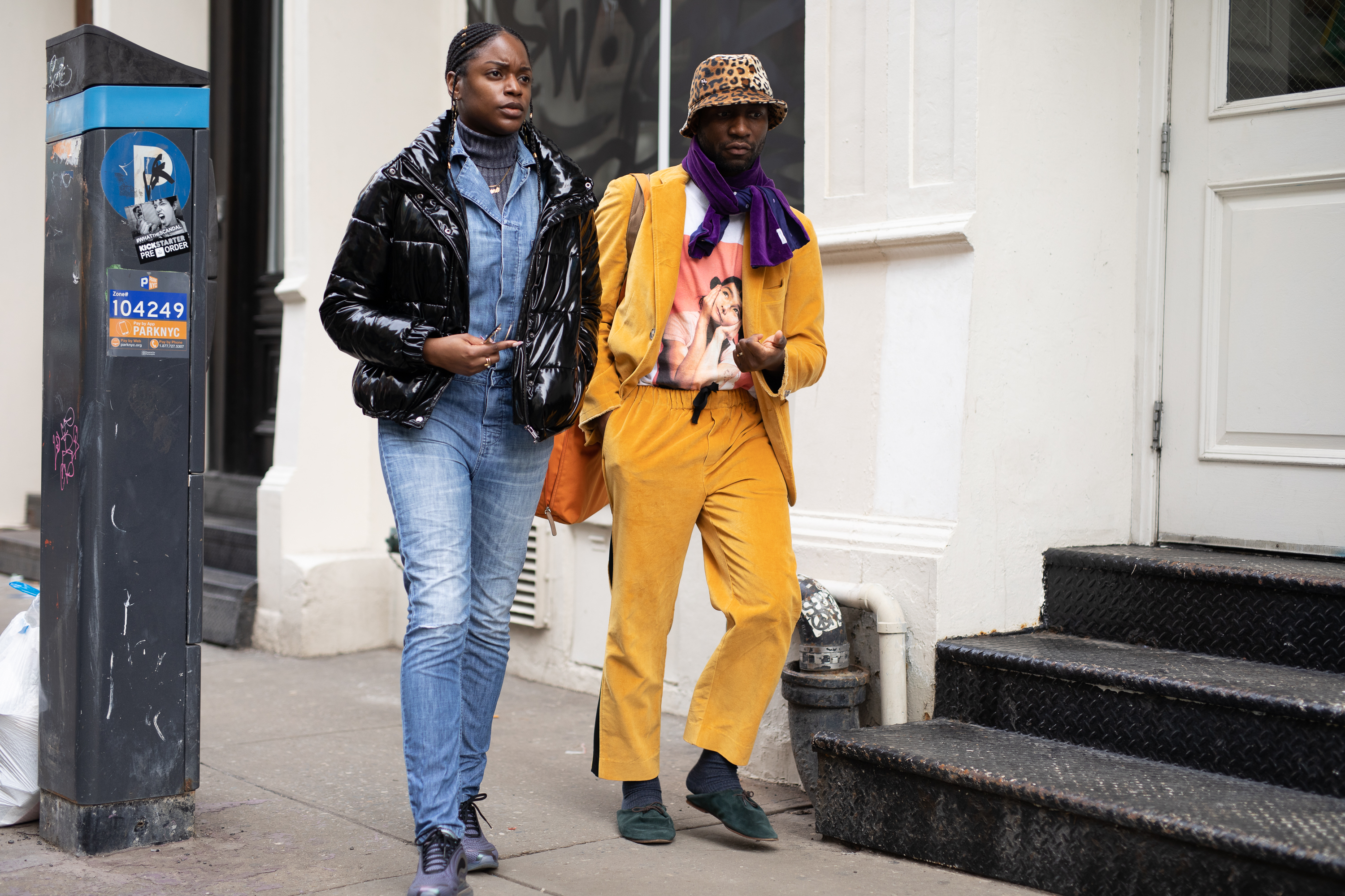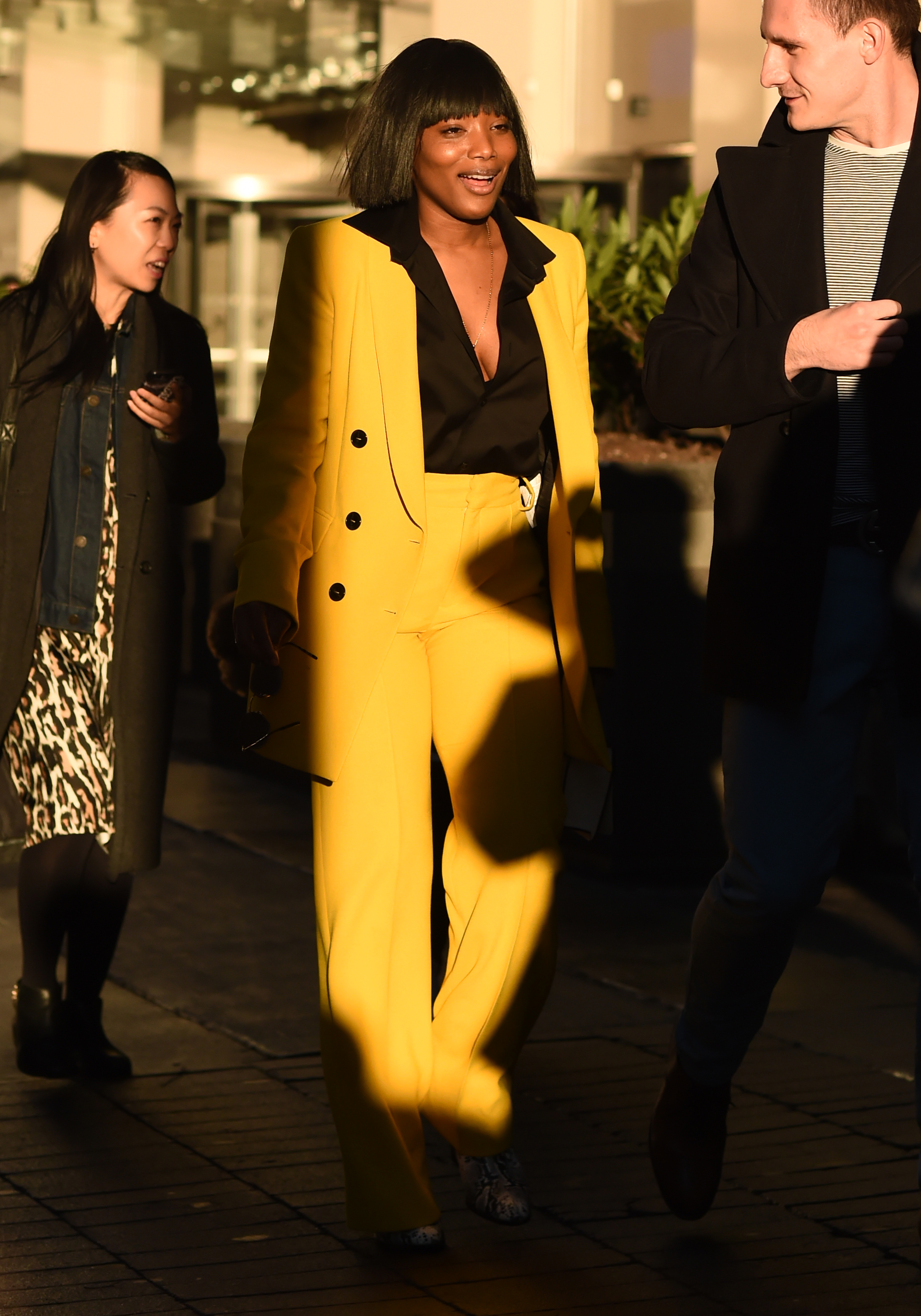 A guest is seen wearing a yellow jacket and pants with black blouse outside the Dear Miler show during New York Fashion Week: Men’s Fall/Winter 2019.