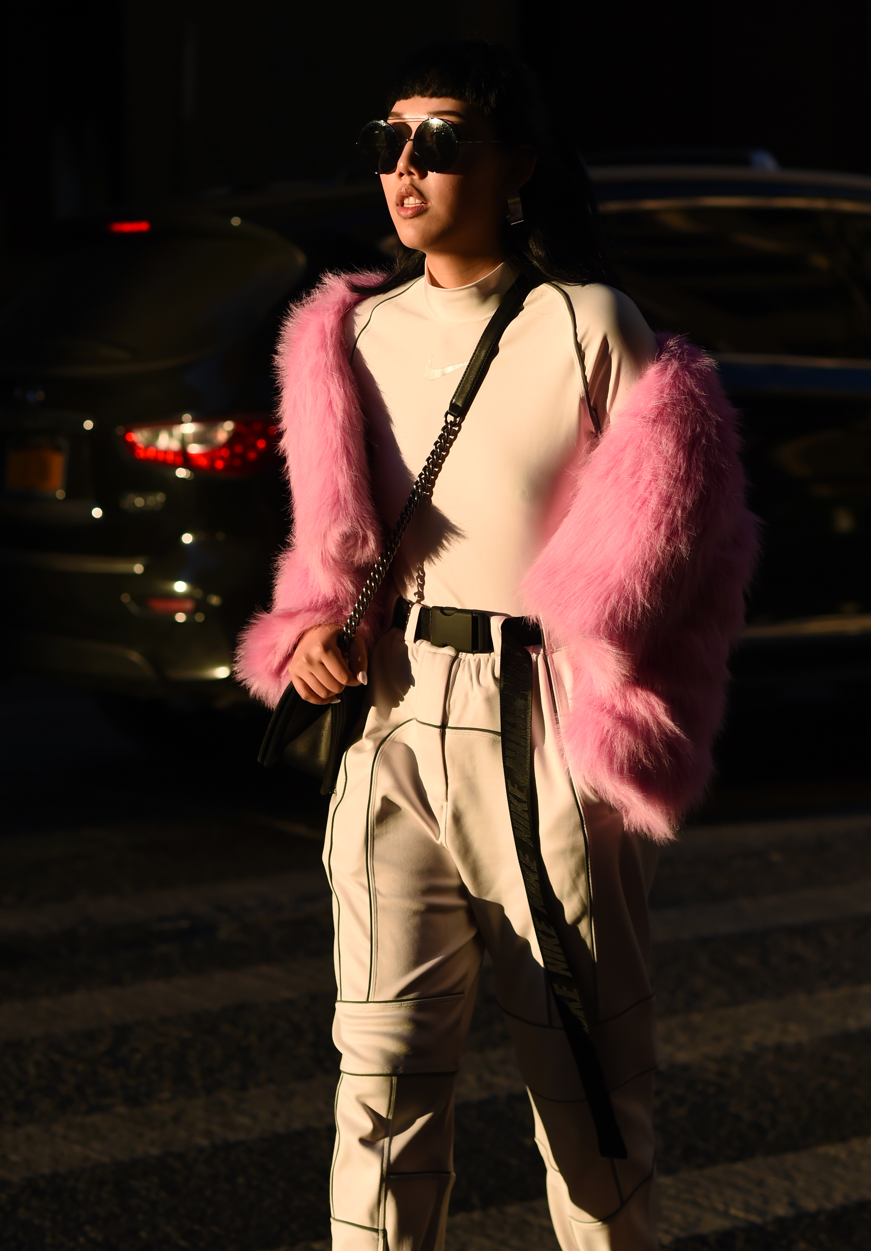 Influencer Michelle Song is seen wearing a pink fur jacket and Nike shirt outside the Tanaka show during New York Fashion Week.