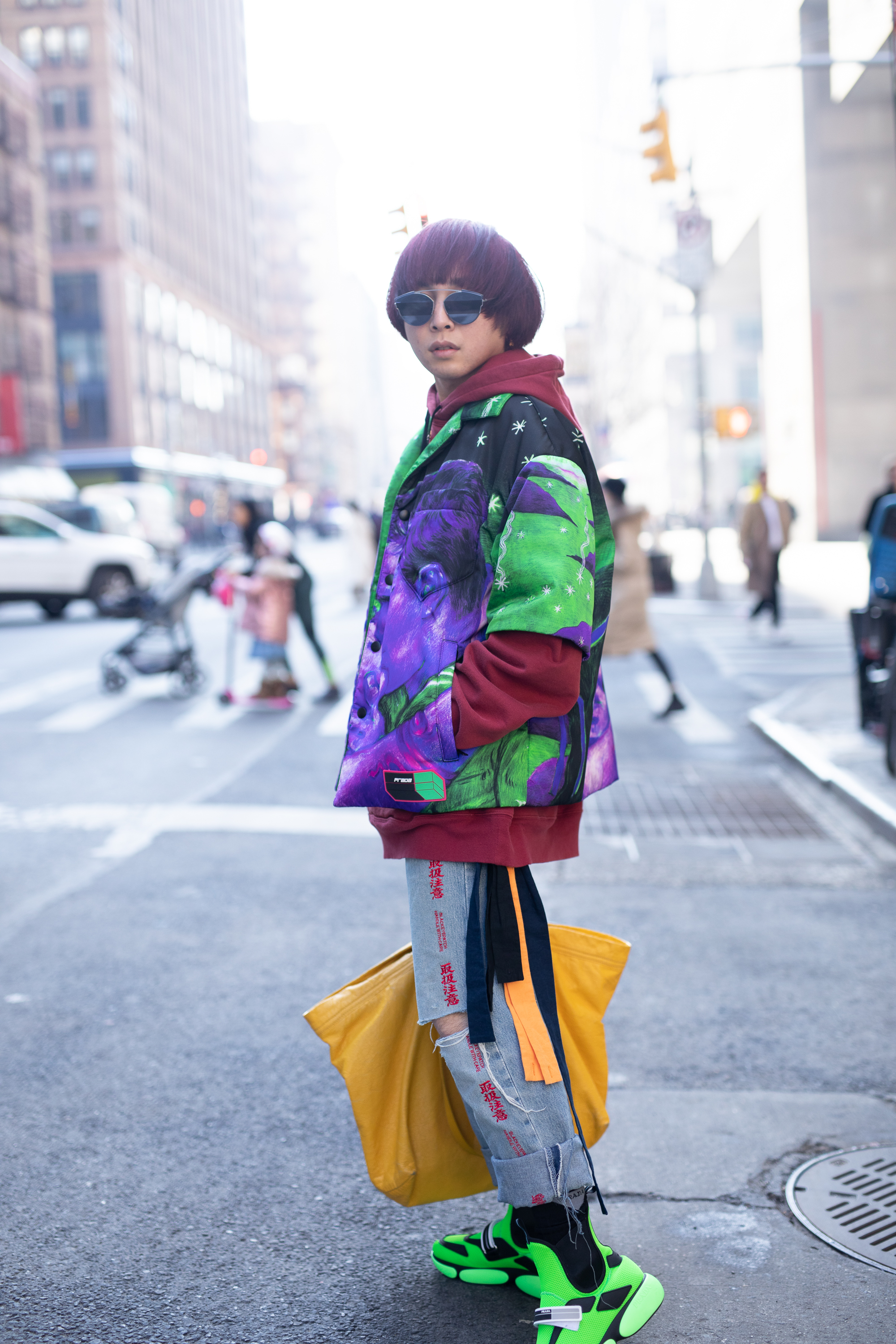Shin Yamada is seen on the street during Men’s New York Fashion Week wearing Prada coat and shoes with Ben Taverniti hoodie, The Black Eye Patch denim jeans and a Balenciaga yellow tote bag.