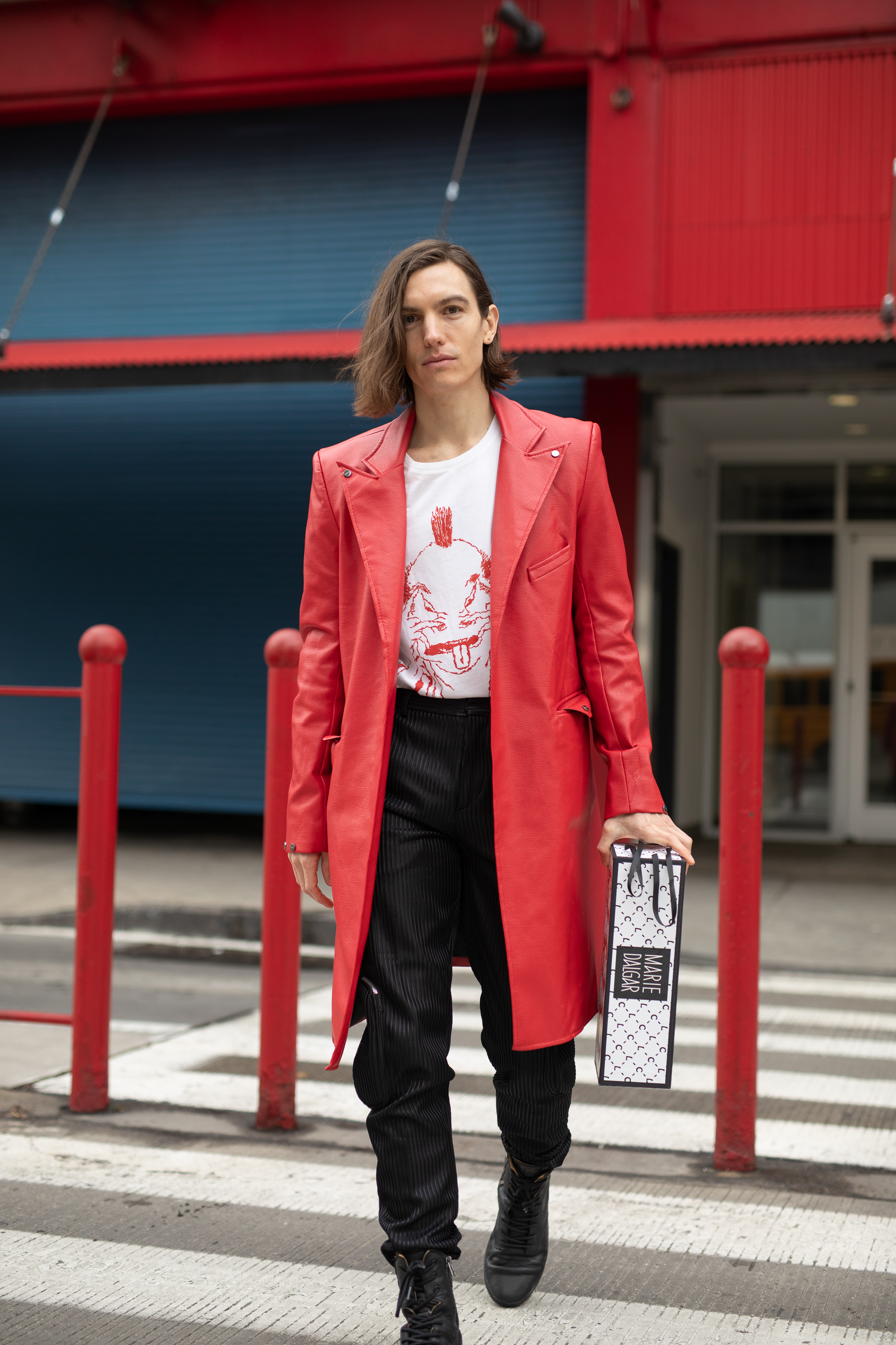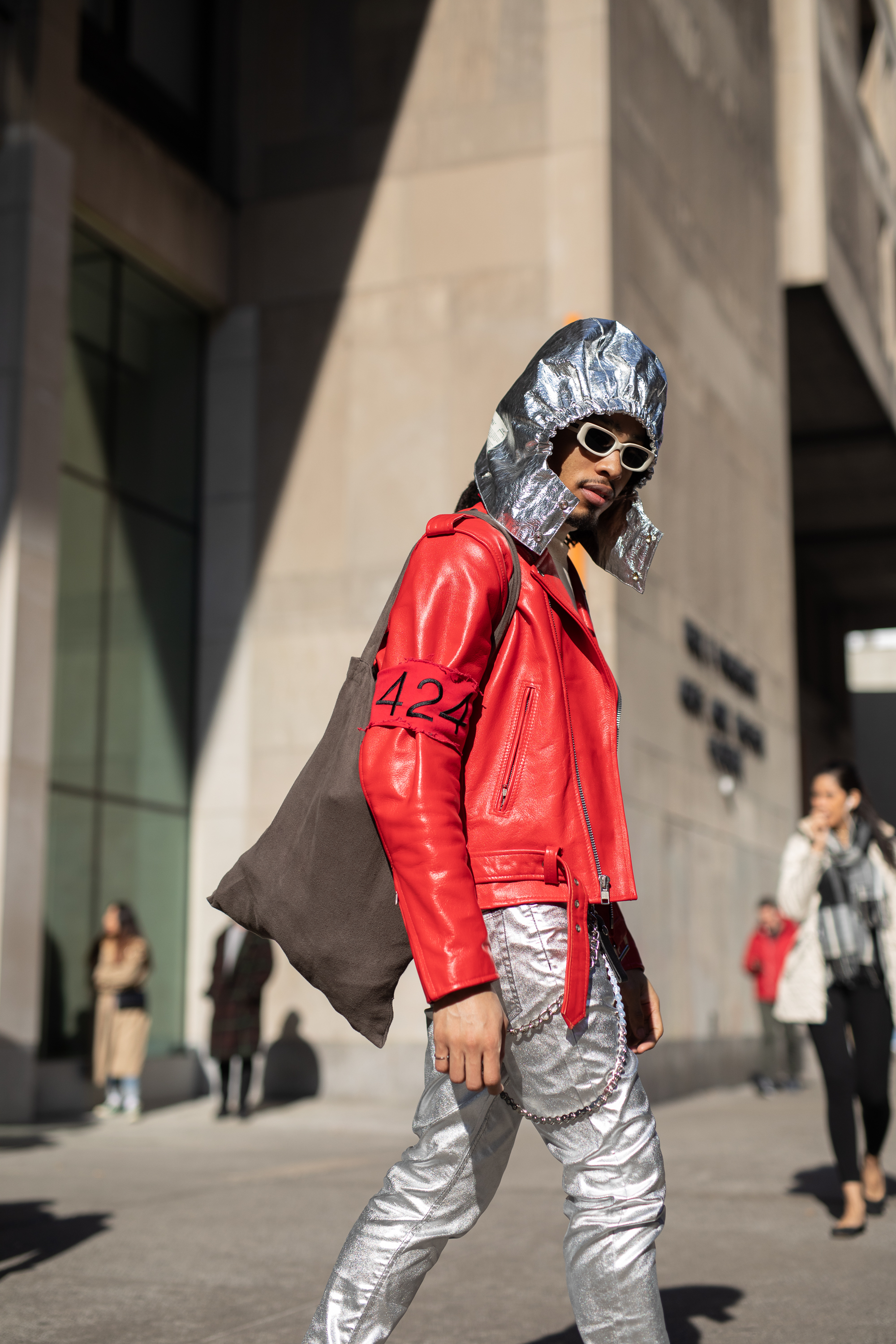 A guest is seen on the street during Men’s New York Fashion Week wearing silver metallic hood and pants with 424 red jacket and a brown tote bag.