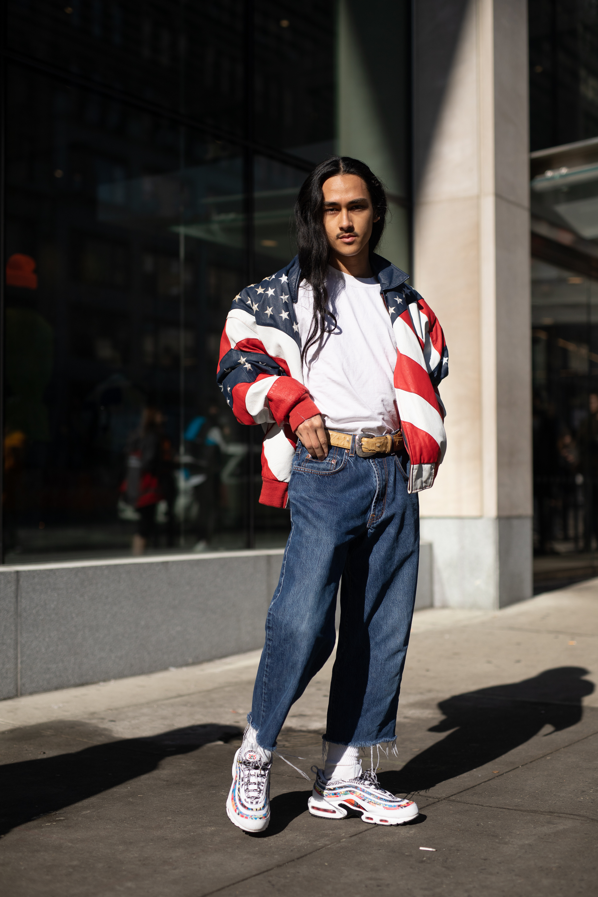 A guest is seen on the street wearing American flag jacket, white shirt, blue jeans with leather belt and white sneakers.
