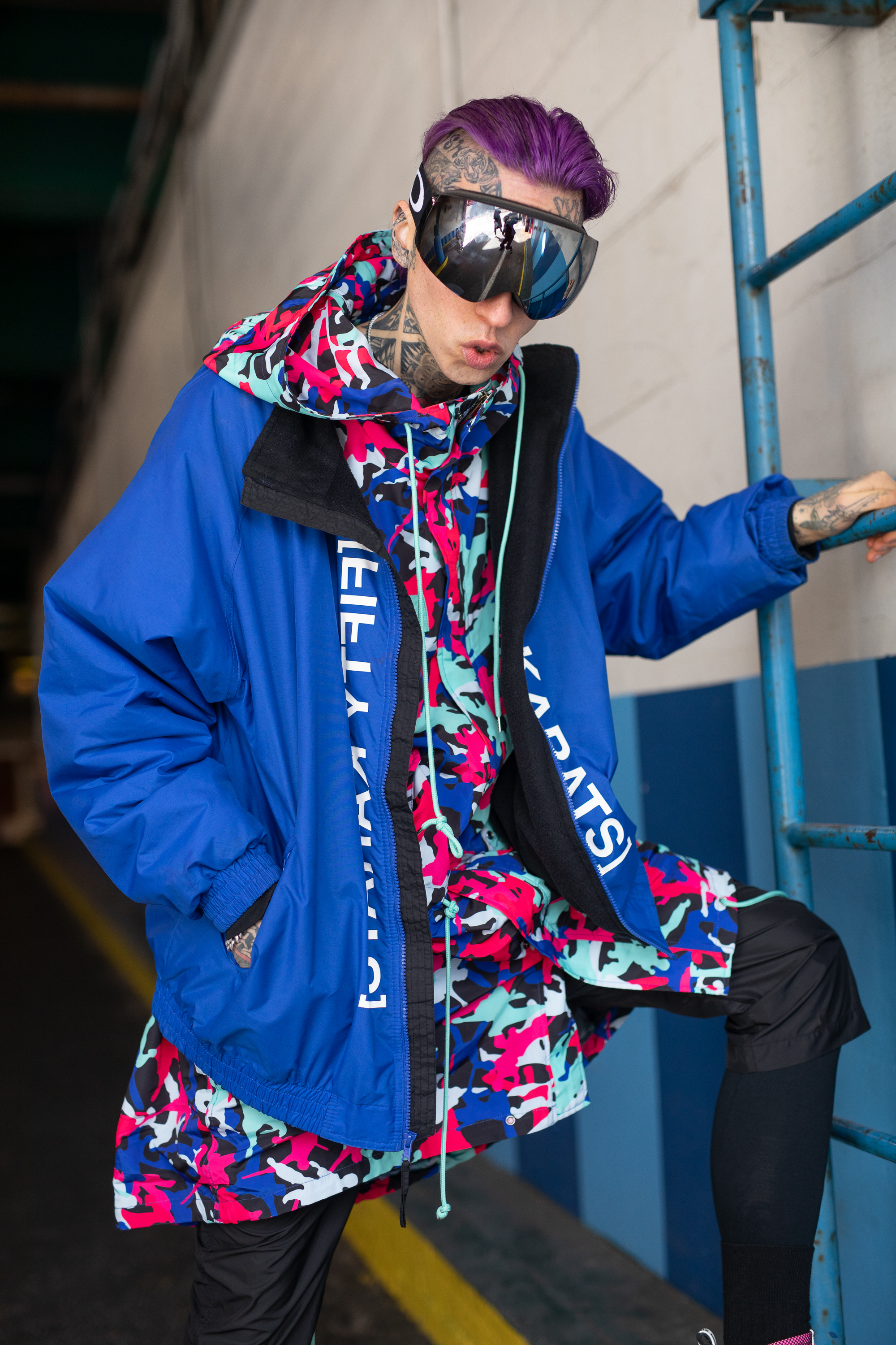 Tattoo model Chris Lavish is seen on the street during Men’s New York Fashion Week wearing Fifty Karats jacket, Swear London shoes and a Defyant hoodie.