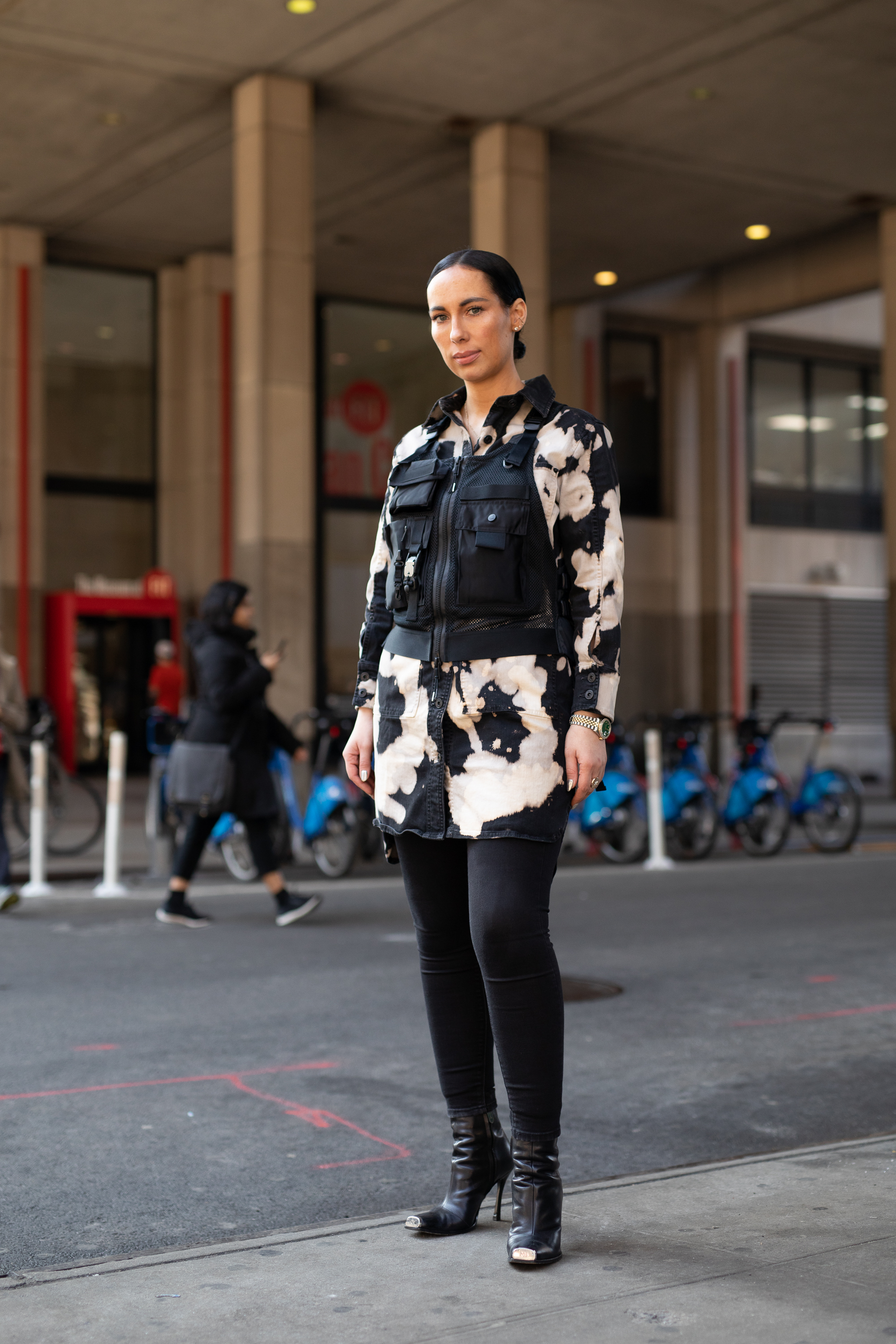 A guest is seen on the street during Men’s New York Fashion Week wearing black/white tie dye shirt, black leggings, black shoes and black utility chest harness.