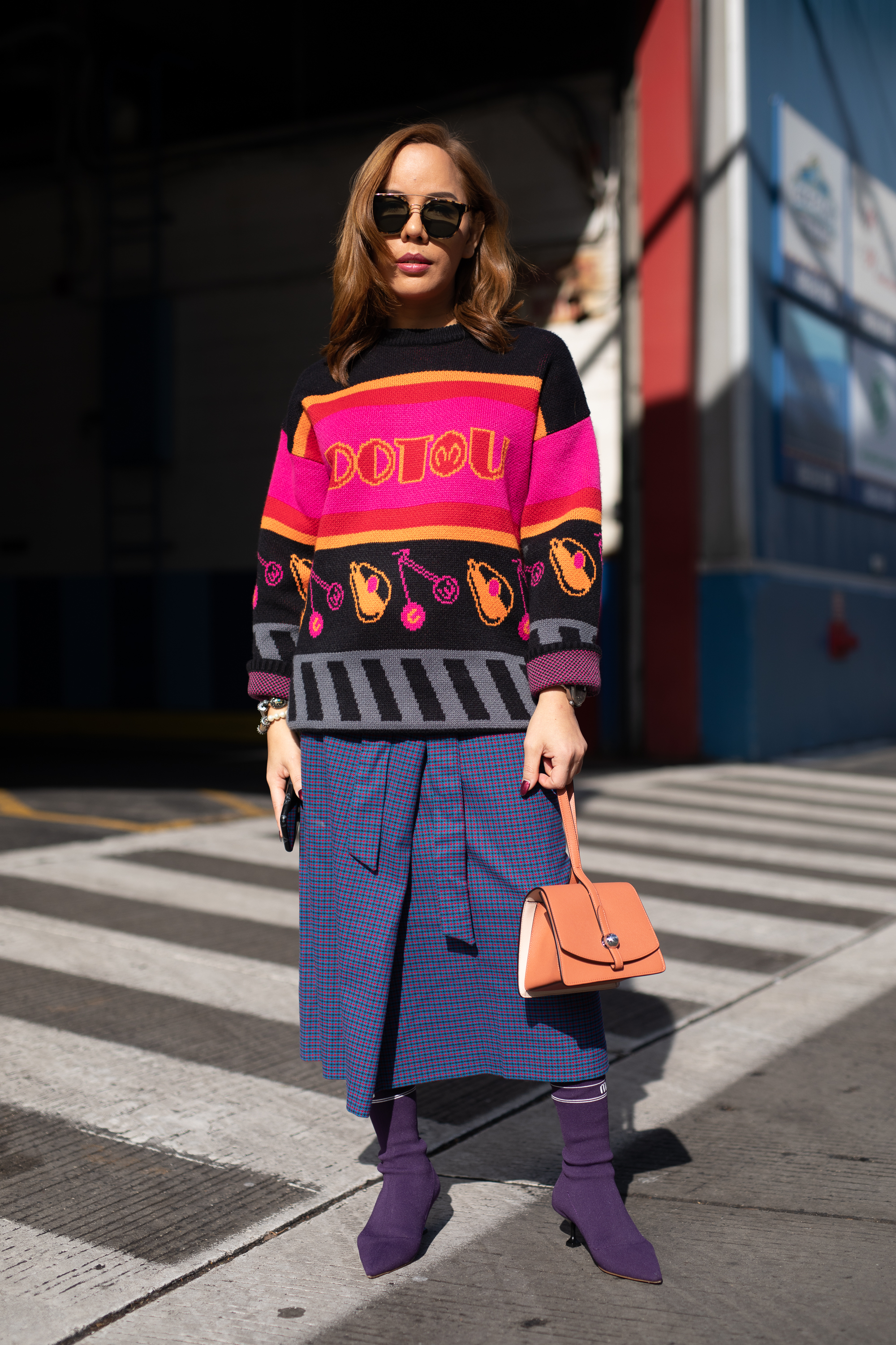 Jixxy Kamchoo is seen on the street during New York Fashion Week wearing MMCW sweater, Zara skirt, Miu Miu boots and Gentle Monster sunglasses.