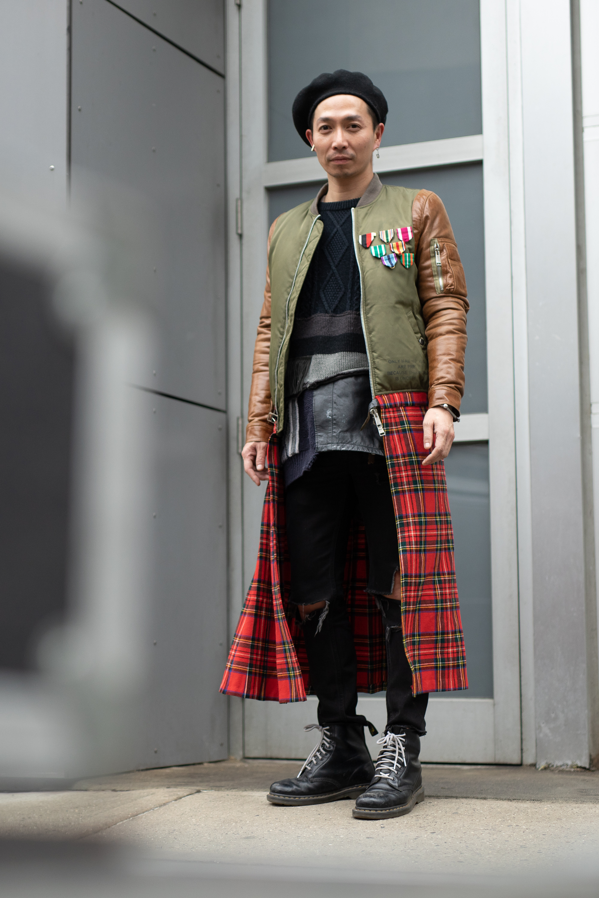A guest is seen on the street attending Rachel Comey during New York Fashion Week wearing green/brown leather military jacket, red plaid with black leather skirt, black boots and a beret.