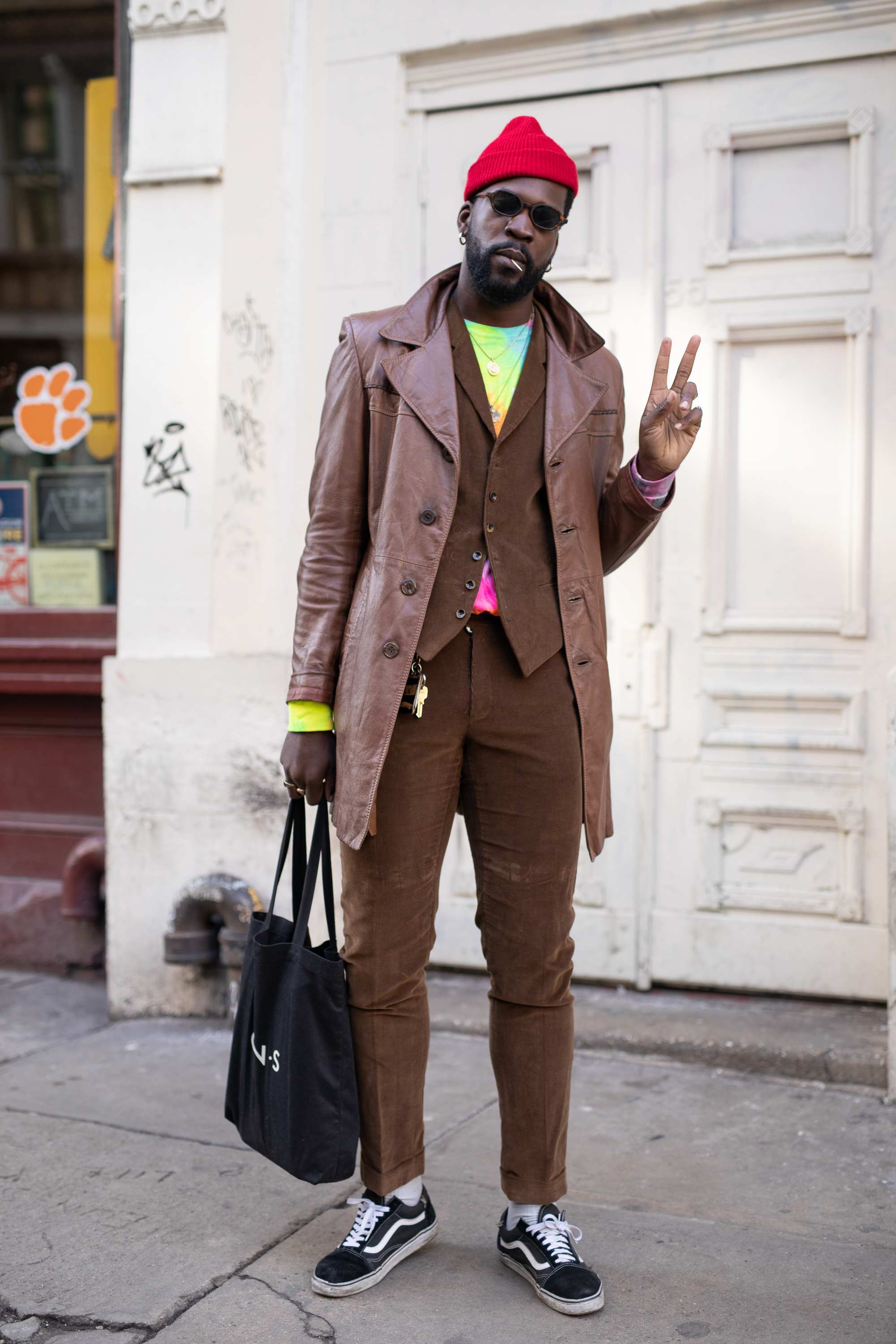 A guest is seen on the street attending Bode wearing a red beanie, brown coat, brown vest and pants, tie-dye shirt, black tote bag and Vans.