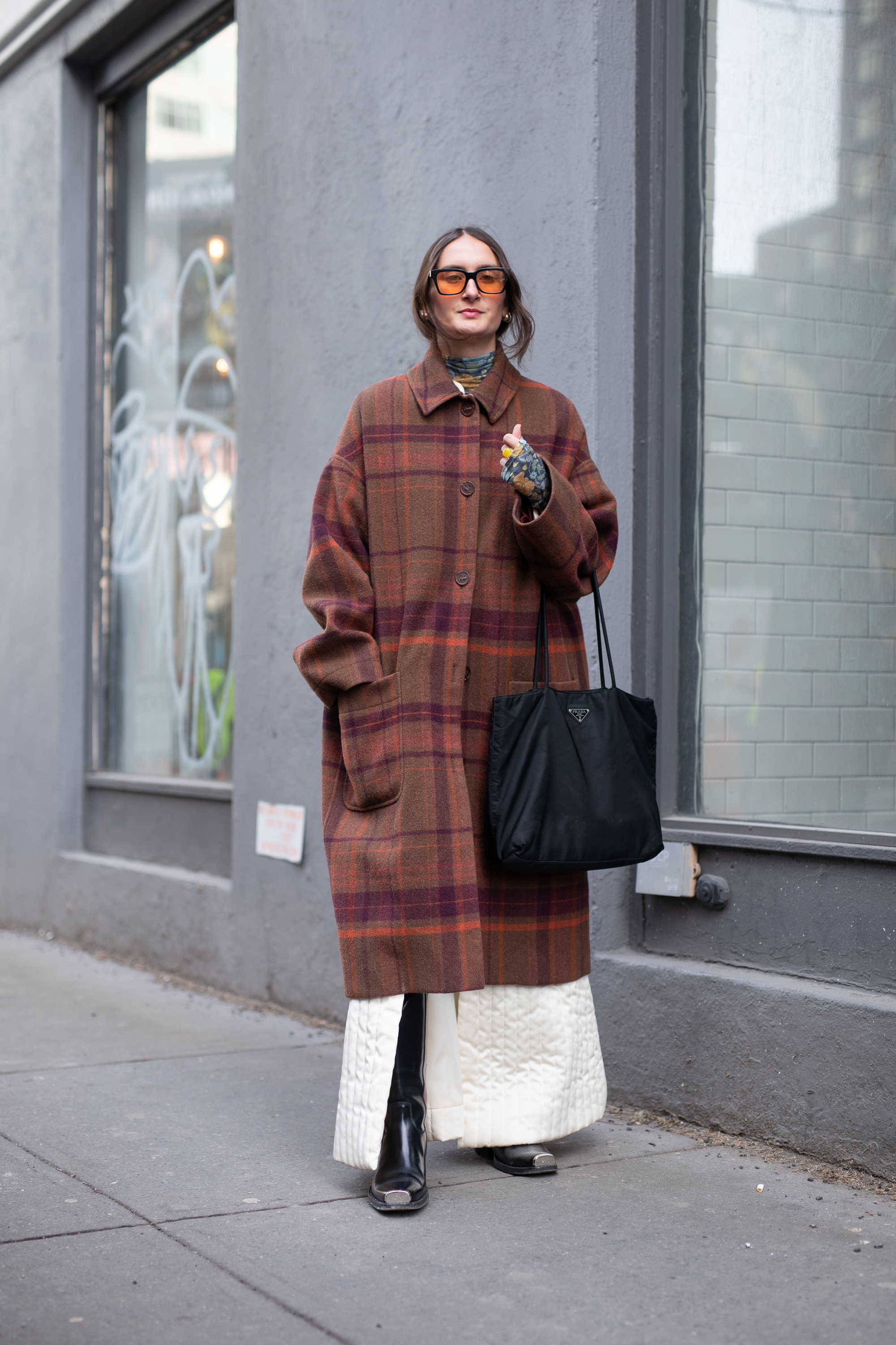 A guest is seen on the street attending Bode during Men’s Fashion Week New York wearing brown plaid wool coat with black bag and a white skirt.