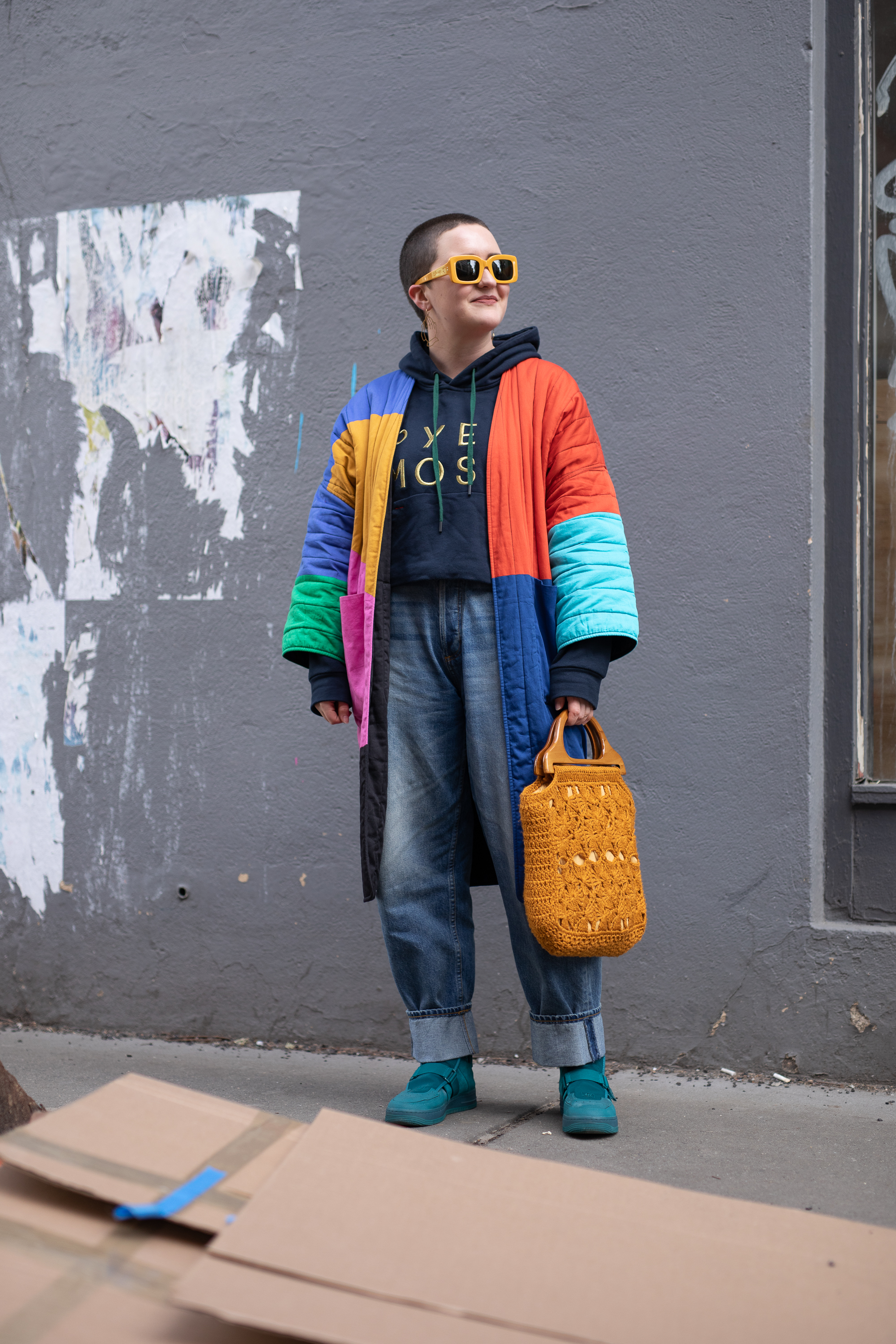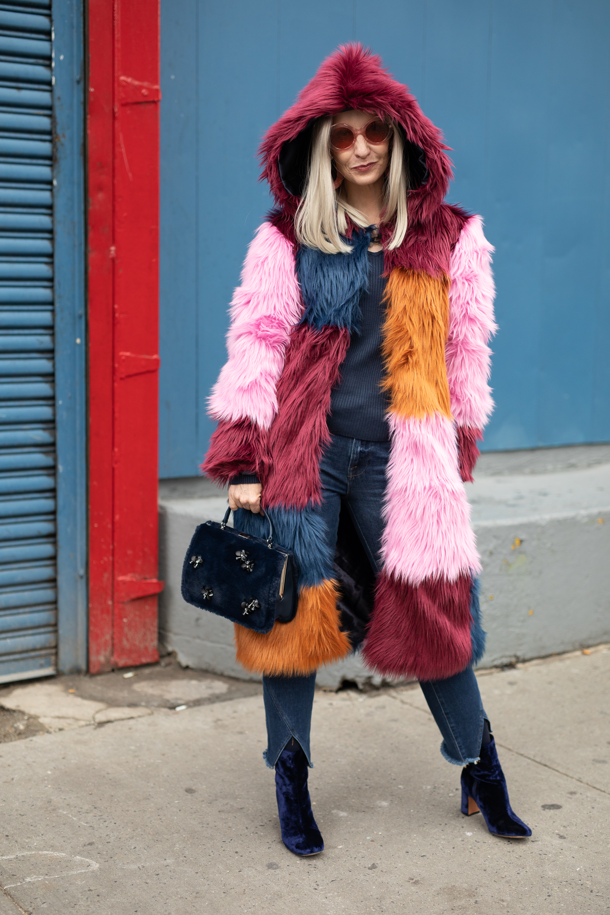 Fashionista associate editor Whitney Bauck is seen on the street attending Bode during Men’s Fashion Week New York wearing a colorful coat with black hoodie, copper bag and blue jeans with teal boots and sunglasses.