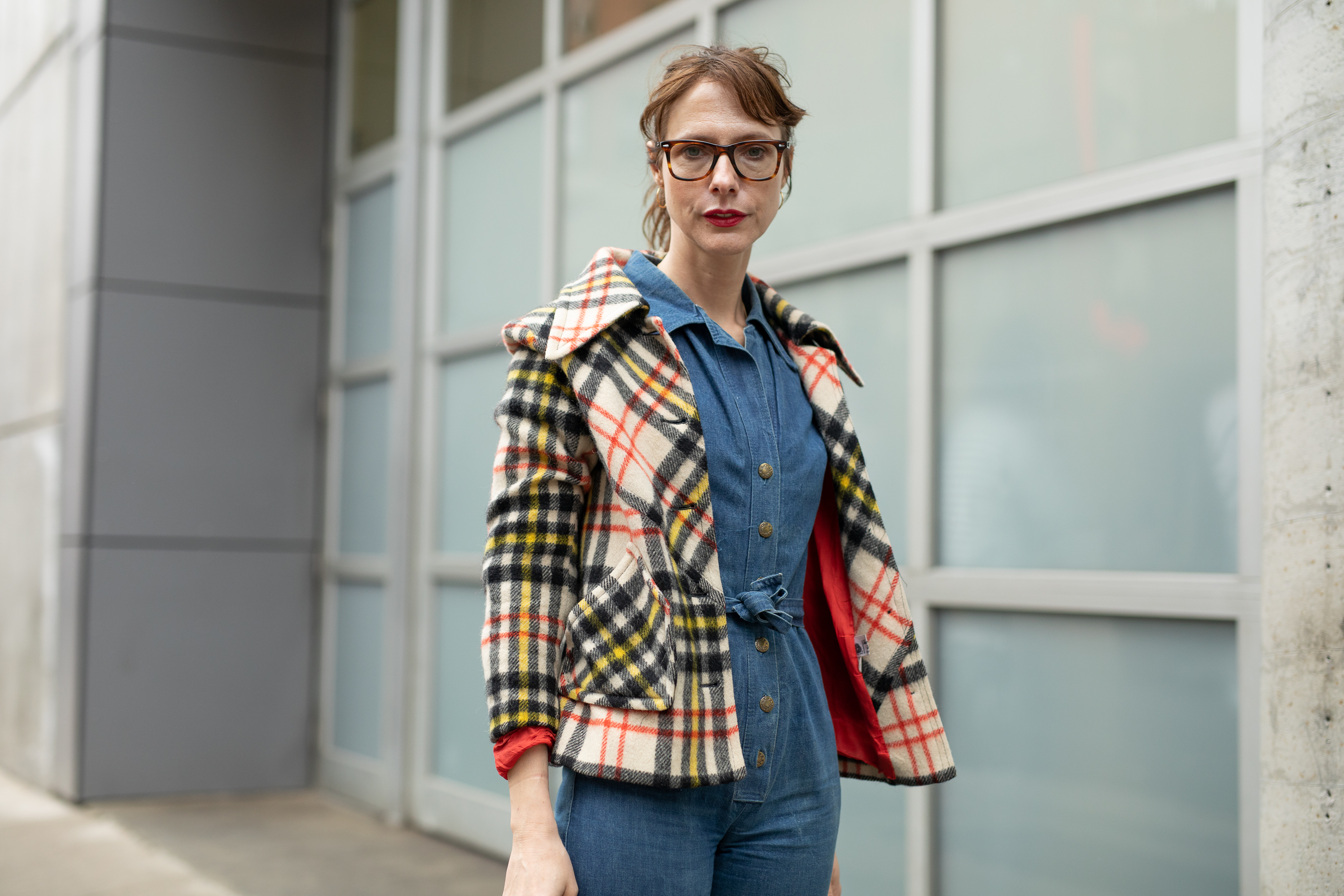 A guest is seen during NYFW wearing a plaid jacket on the streets of New York.