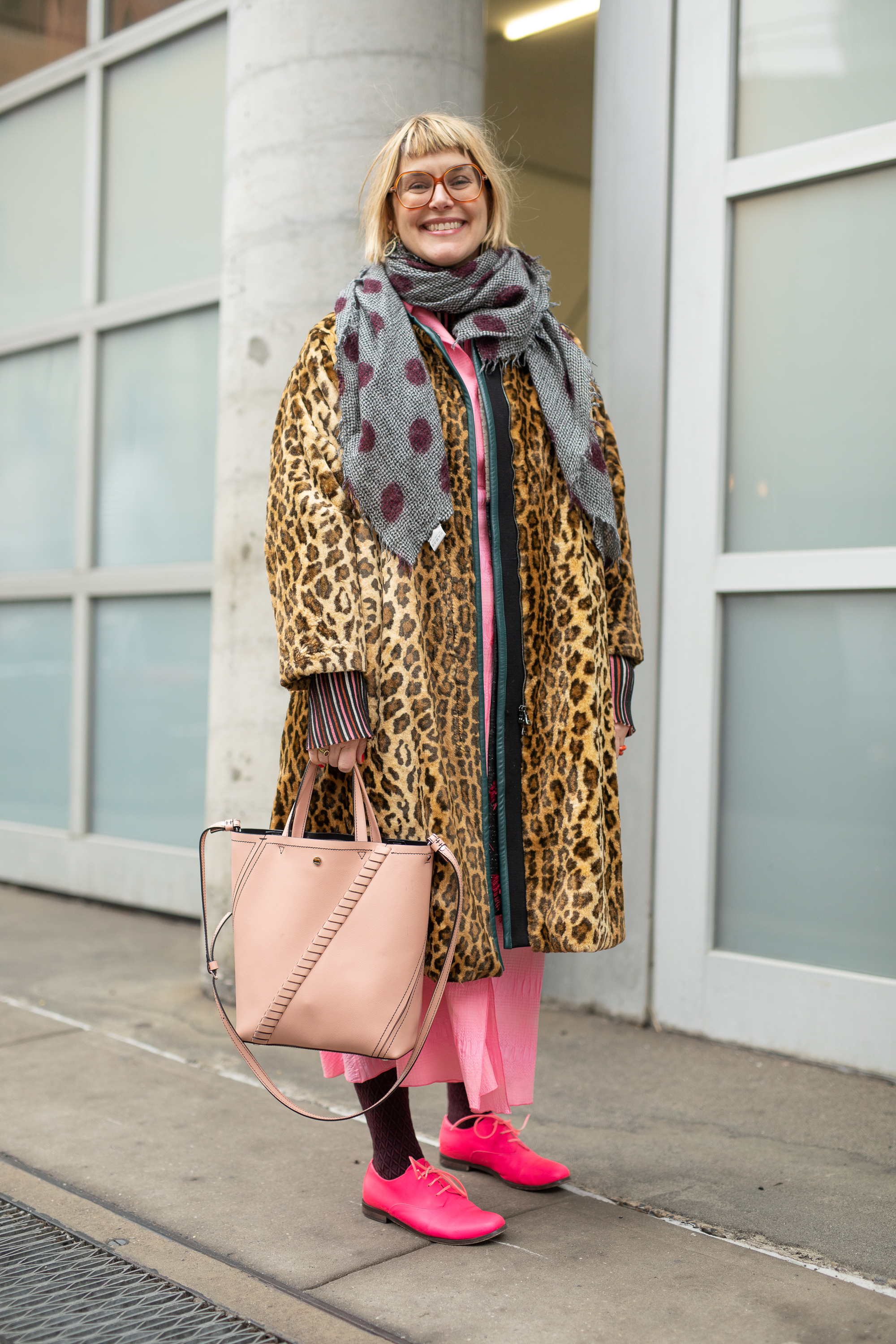 A guest is seen on the street attending Rachel Comey during New York Fashion Week wearing leopard print coat, grey/brown polka dot scarf, peach bag, pink skirt and neon pink sneakers.