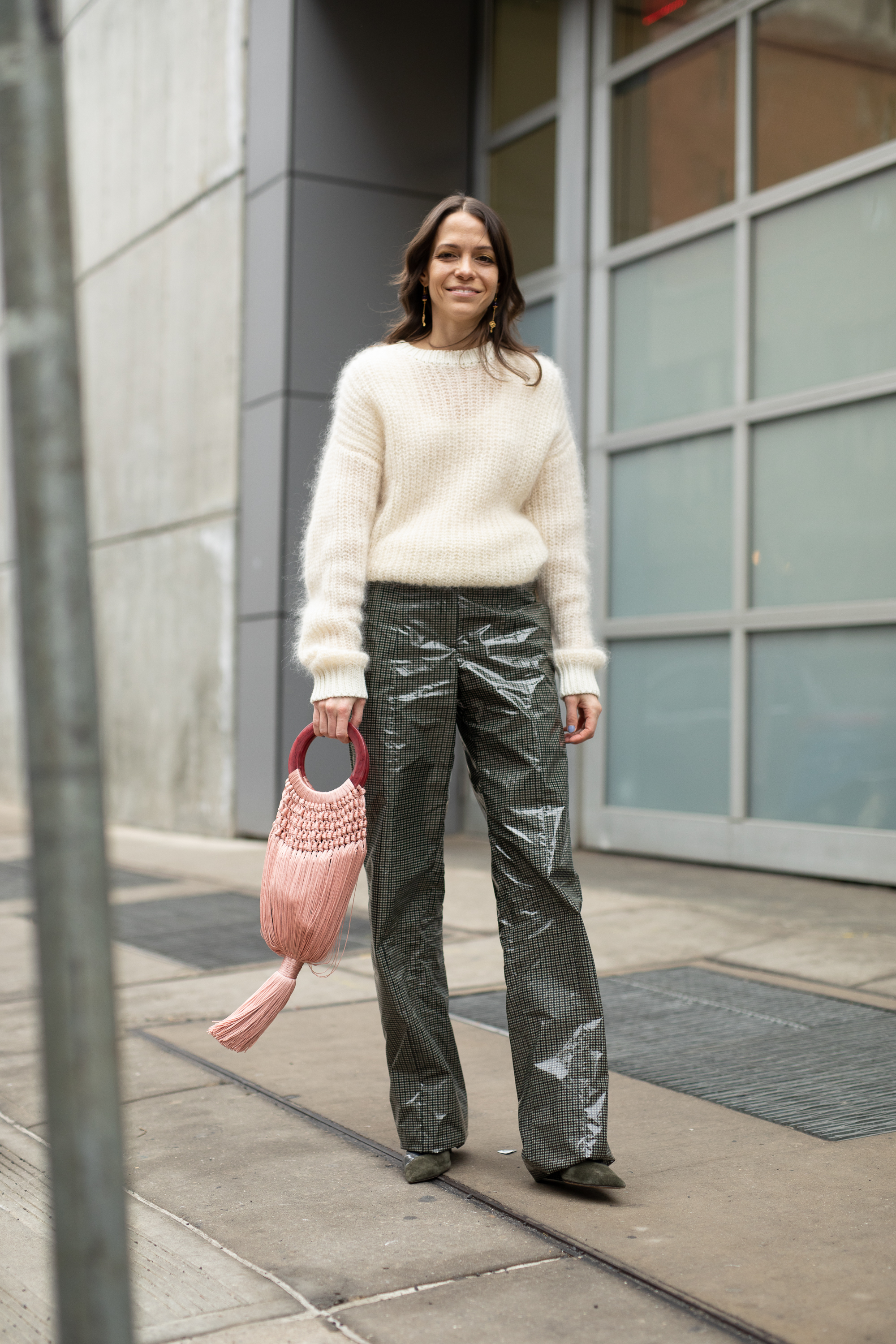 A guest is seen on the street attending Rachel Comey during New York Fashion Week wearing a cream sweater, vinyl dark green pants and a pink silk bag.
