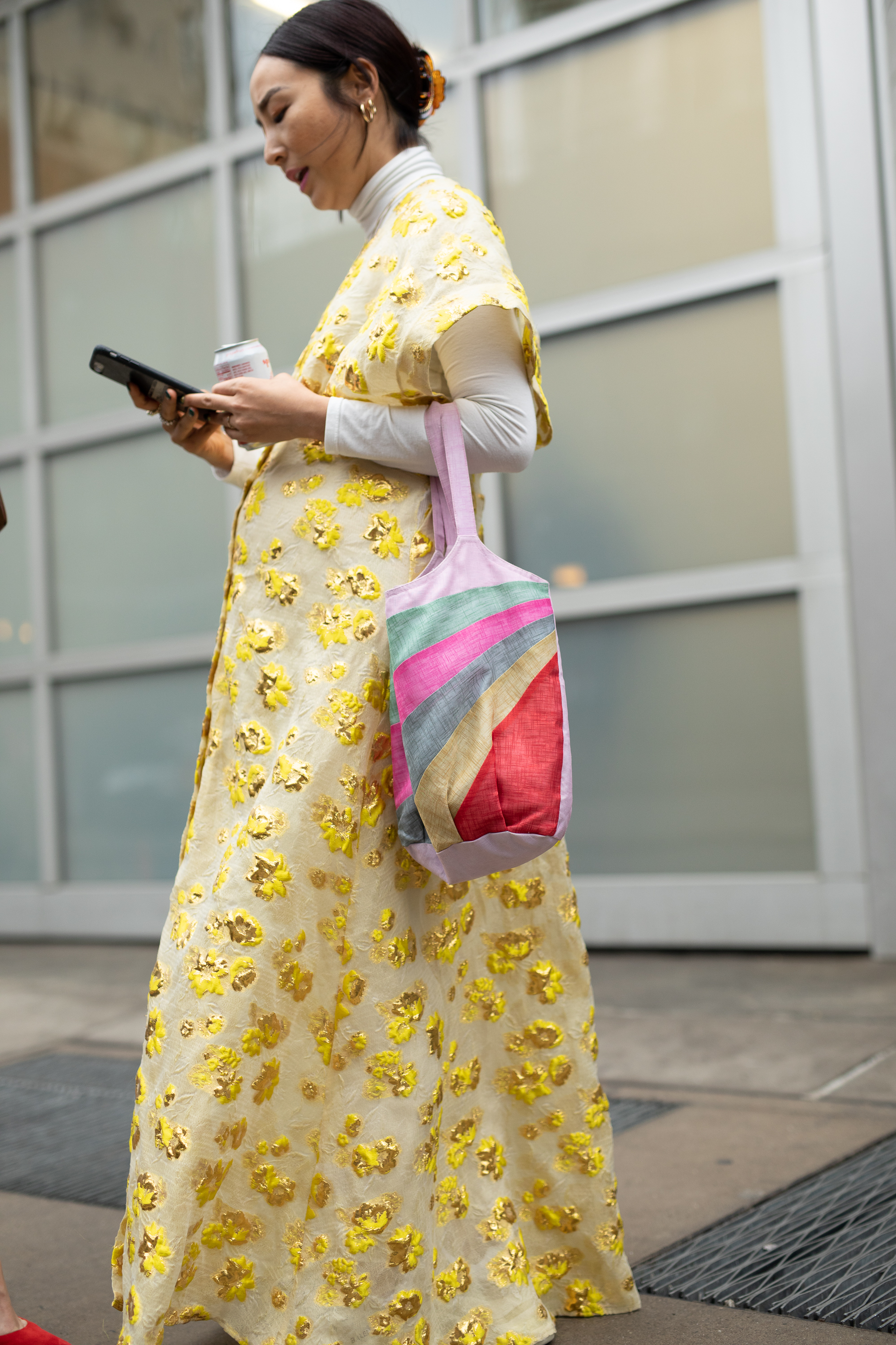 A guest is seen on the street attending Rachel Comey during New York Fashion Week wearing pastel yellow with gold pattern dress and multi-color stripe purple pastel bag.