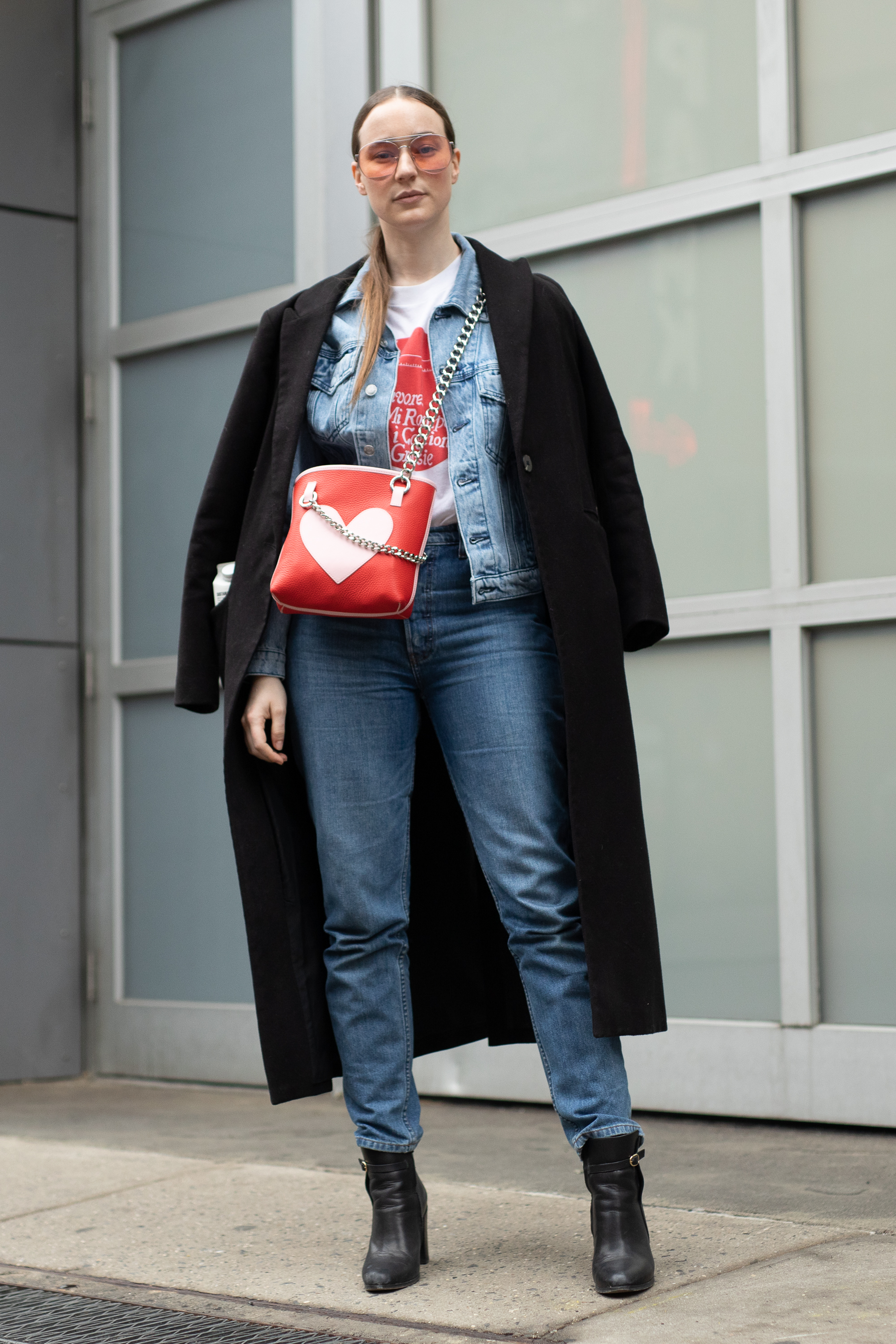 A guest is seen on the street attending Rachel Comey wearing black wool coat, denim jacket and jeans, red heart print bag, black boots.