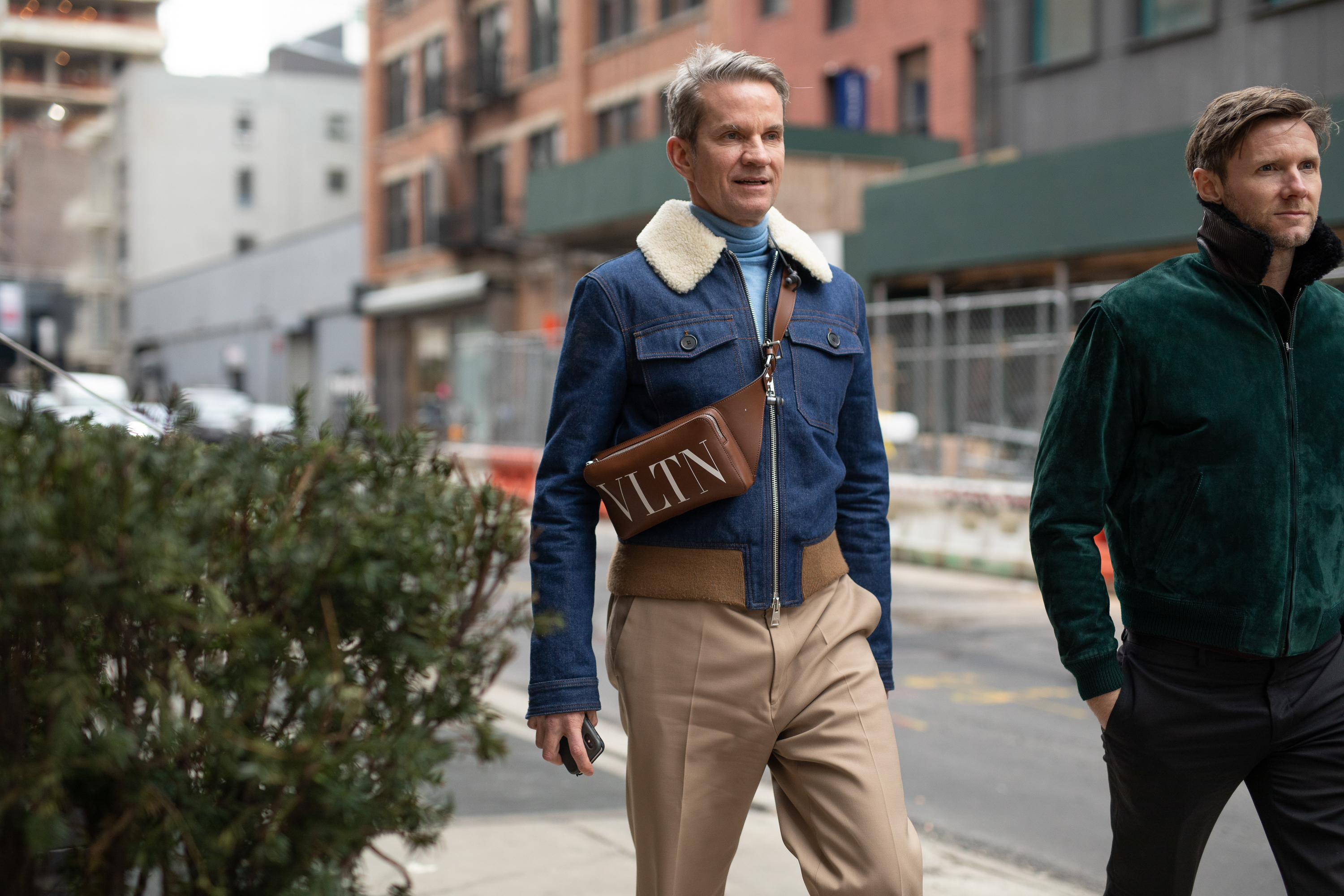 A guest is seen on the street attending Rachel Comey during New York Fashion Week wearing navy with fur collar jacket, Valentino brown cross-body bag and khaki pants.