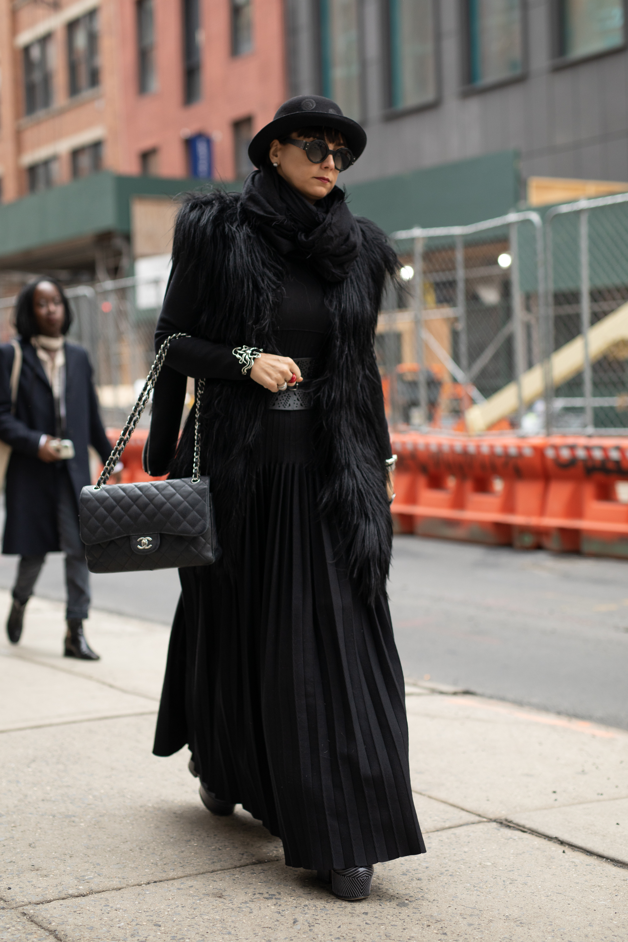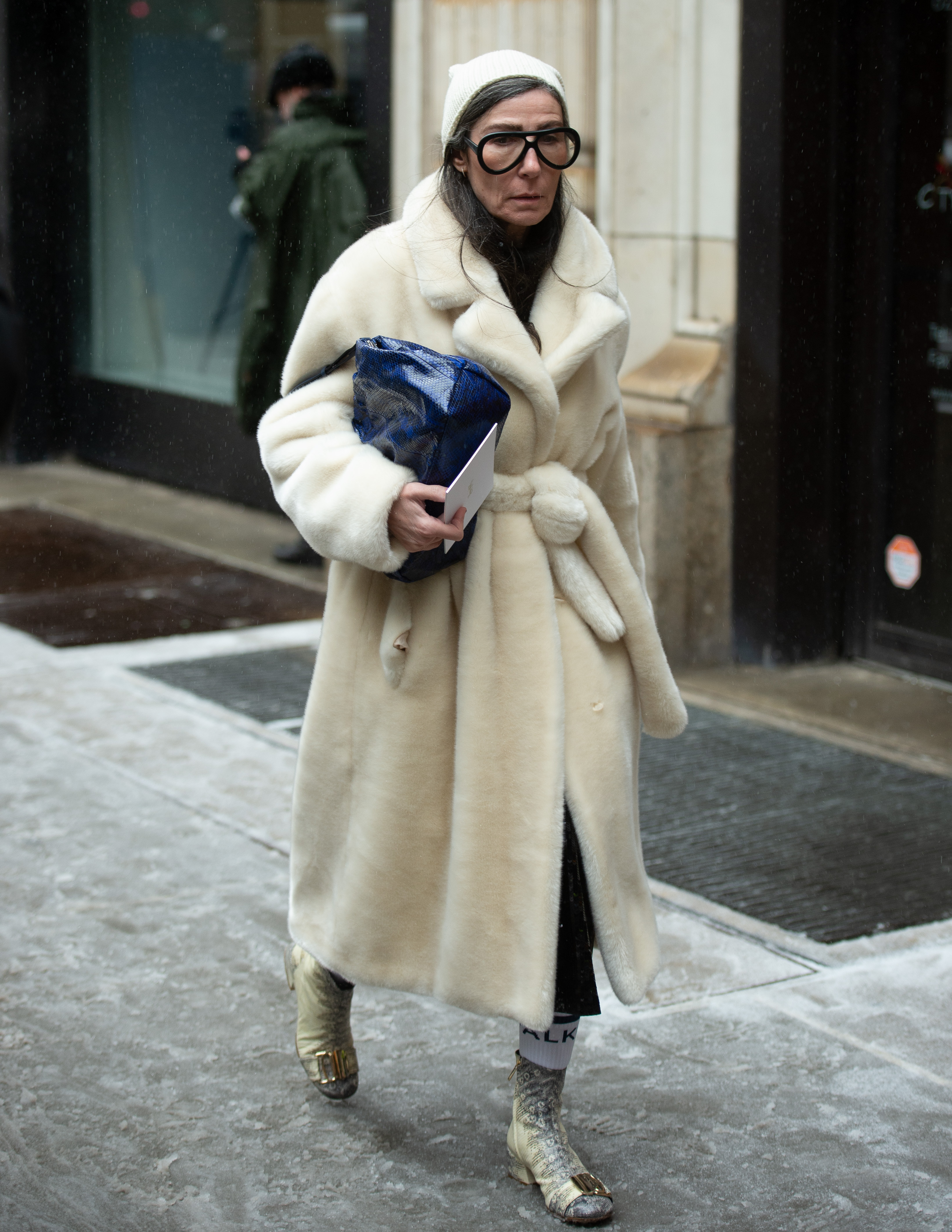 A guest is seen outside NYFW wearing a large robe coat and large black glasses.