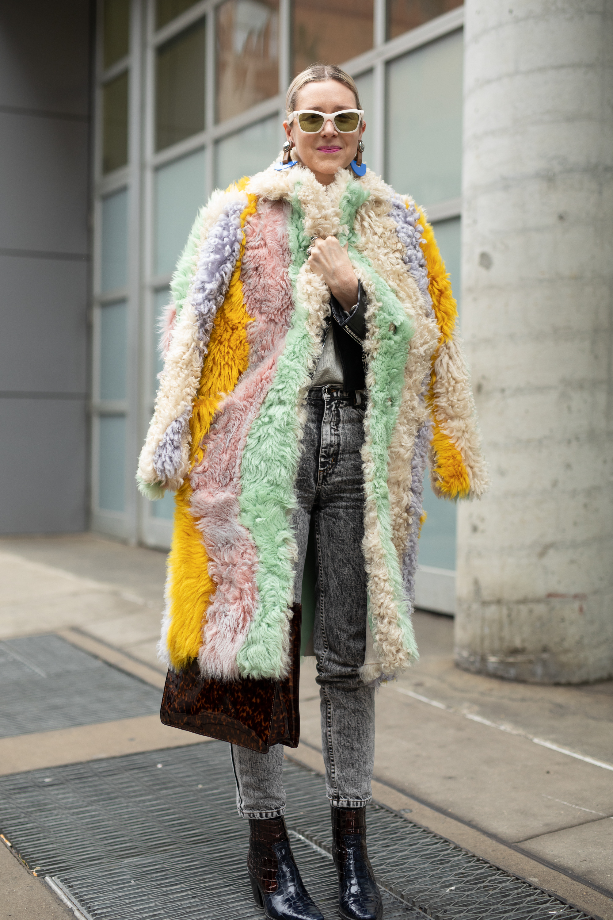 A guest is seen on the street attending Rachel Comey during New York Fashion Week wearing colorful pastel faux fur coat, grey jeans, black shoes and brown bag.