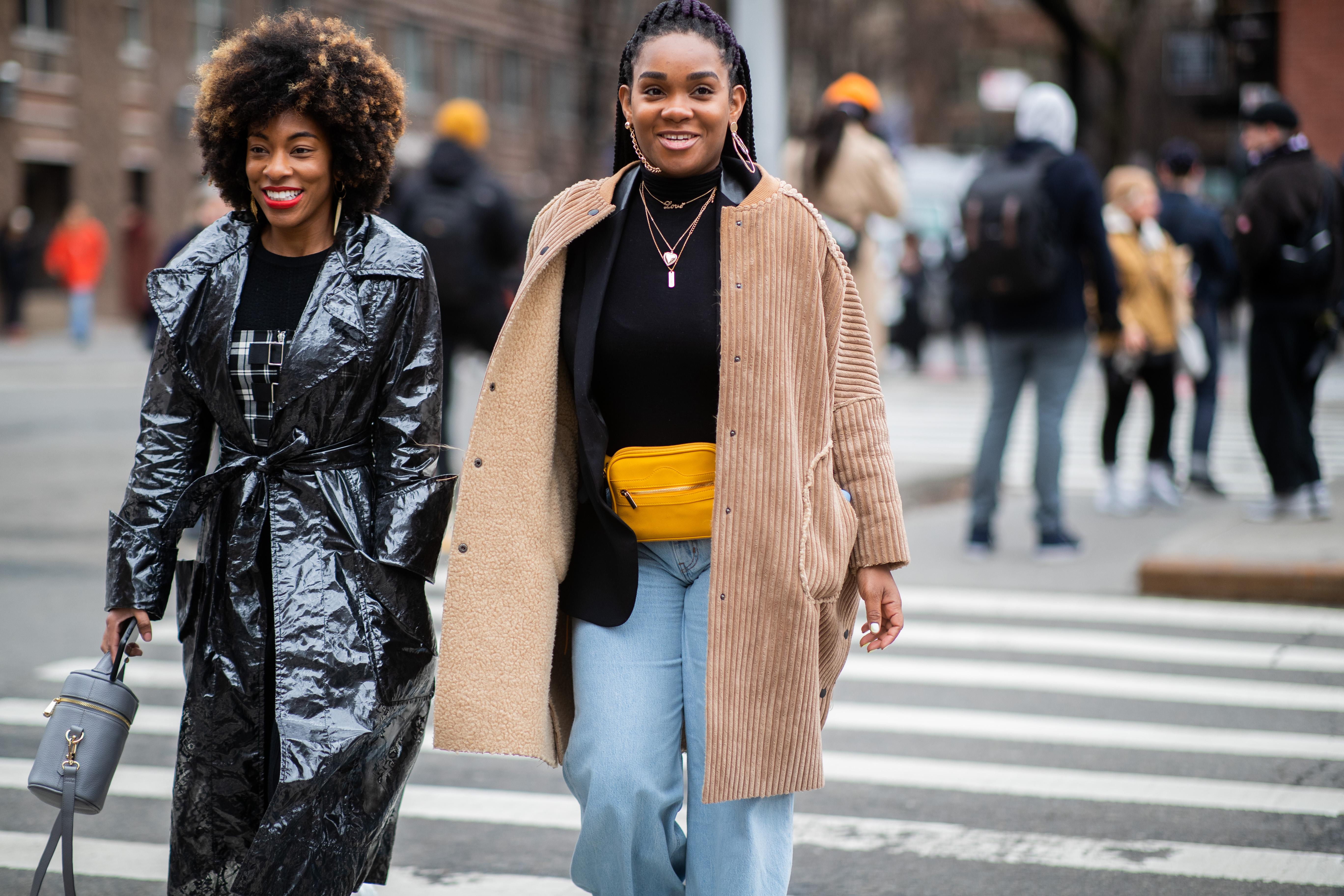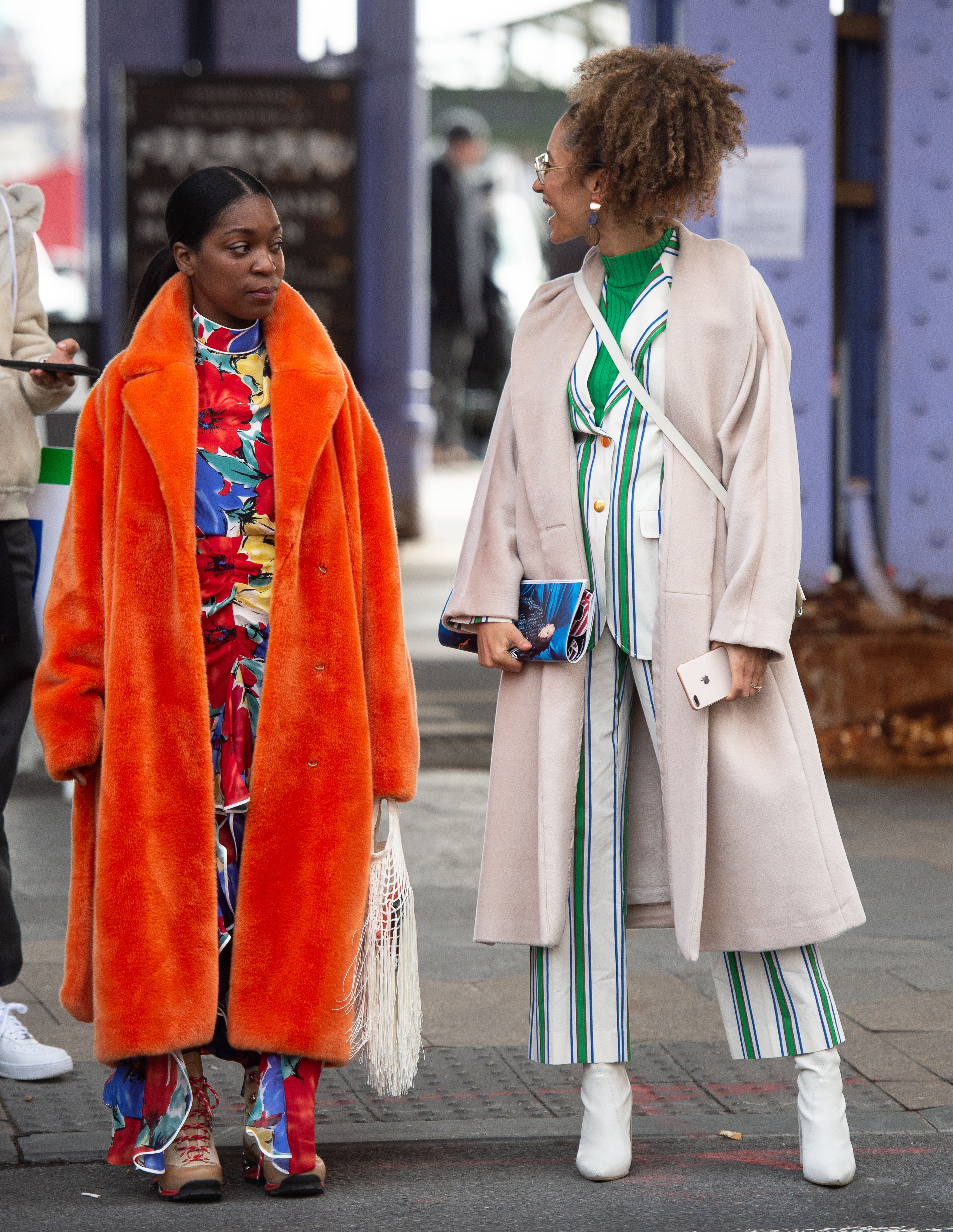 Journalist Elaine Welteroth, wearing a striped suit and overcoat, and a guest, wearing a floral outfit with an orange coat, are seen during NYFW.