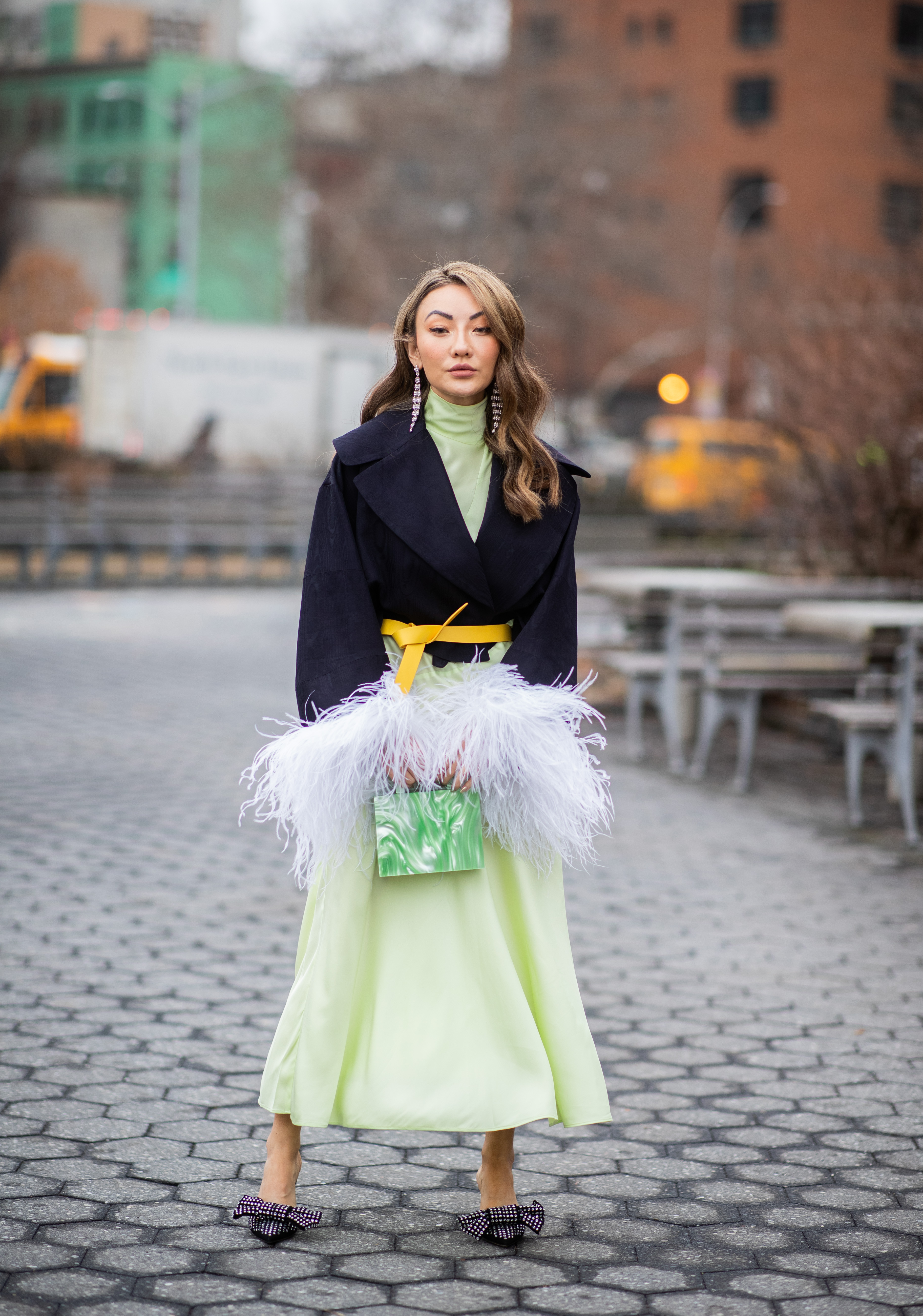 Jessica Wang is seen wearing a light green dress outside Tadashi Shoji during New York Fashion Week.