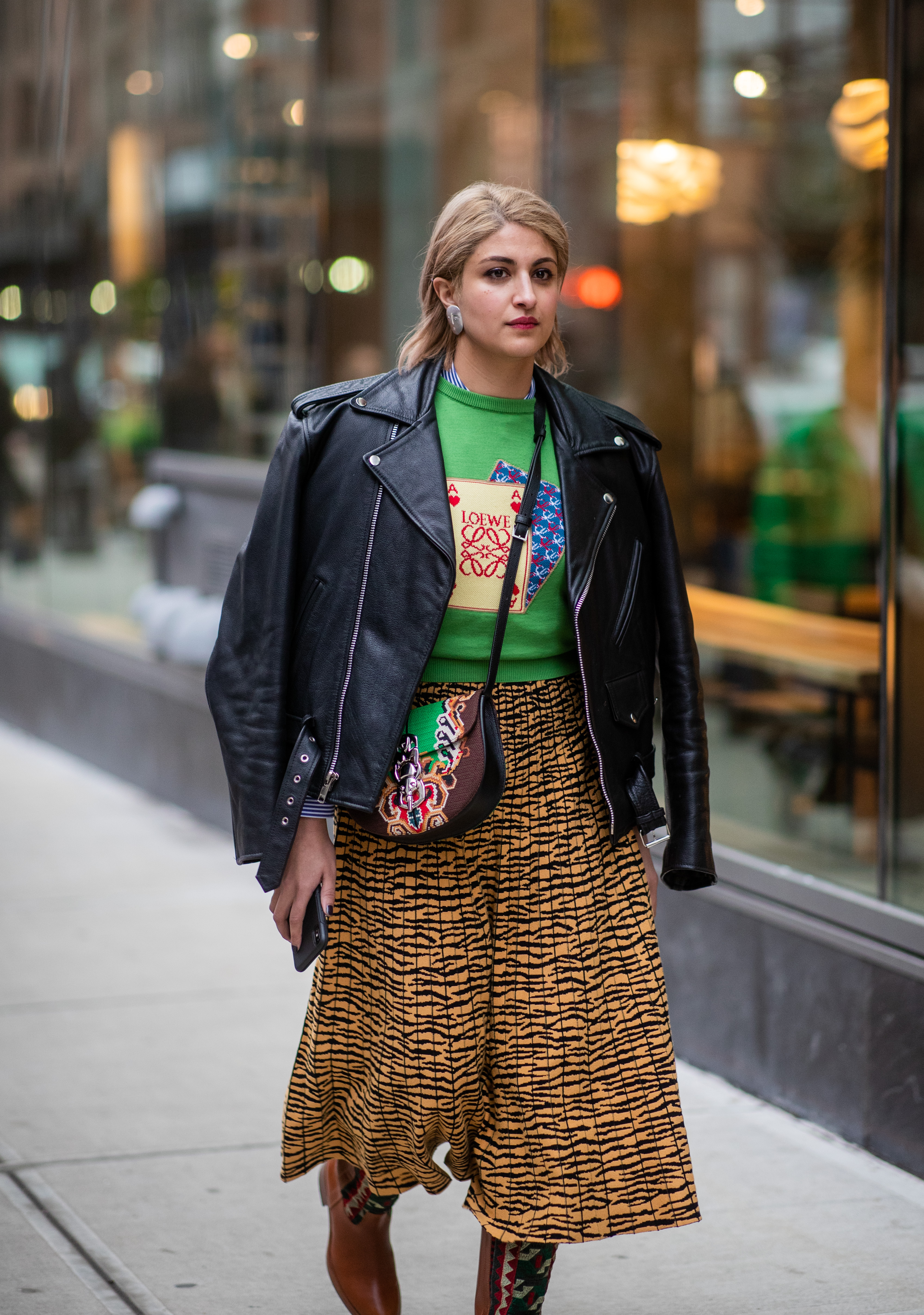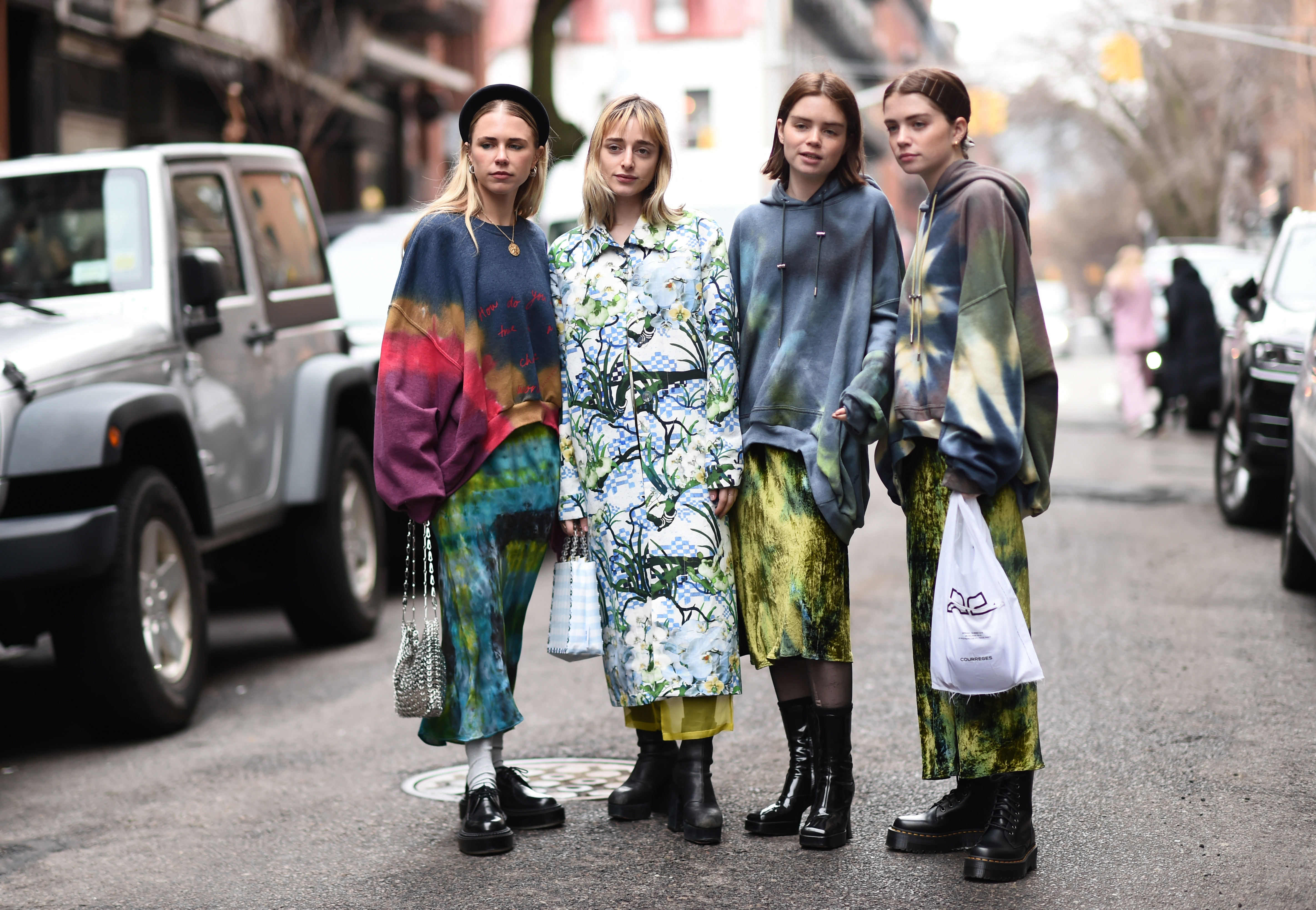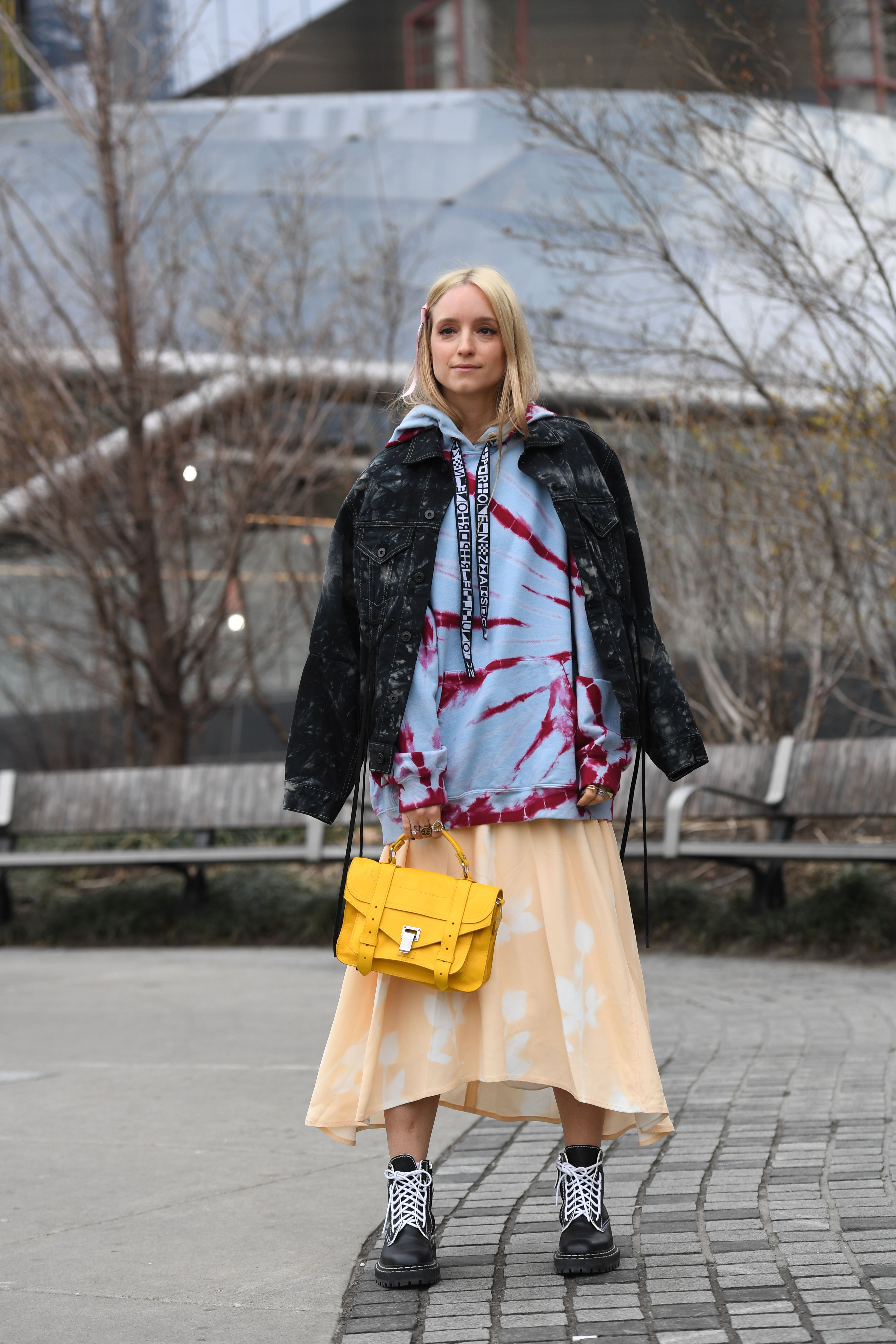 A guest is seen in the New York streets wearing a tie-dye sweatshirt, black jacket and skirt, carrying a yellow bag.