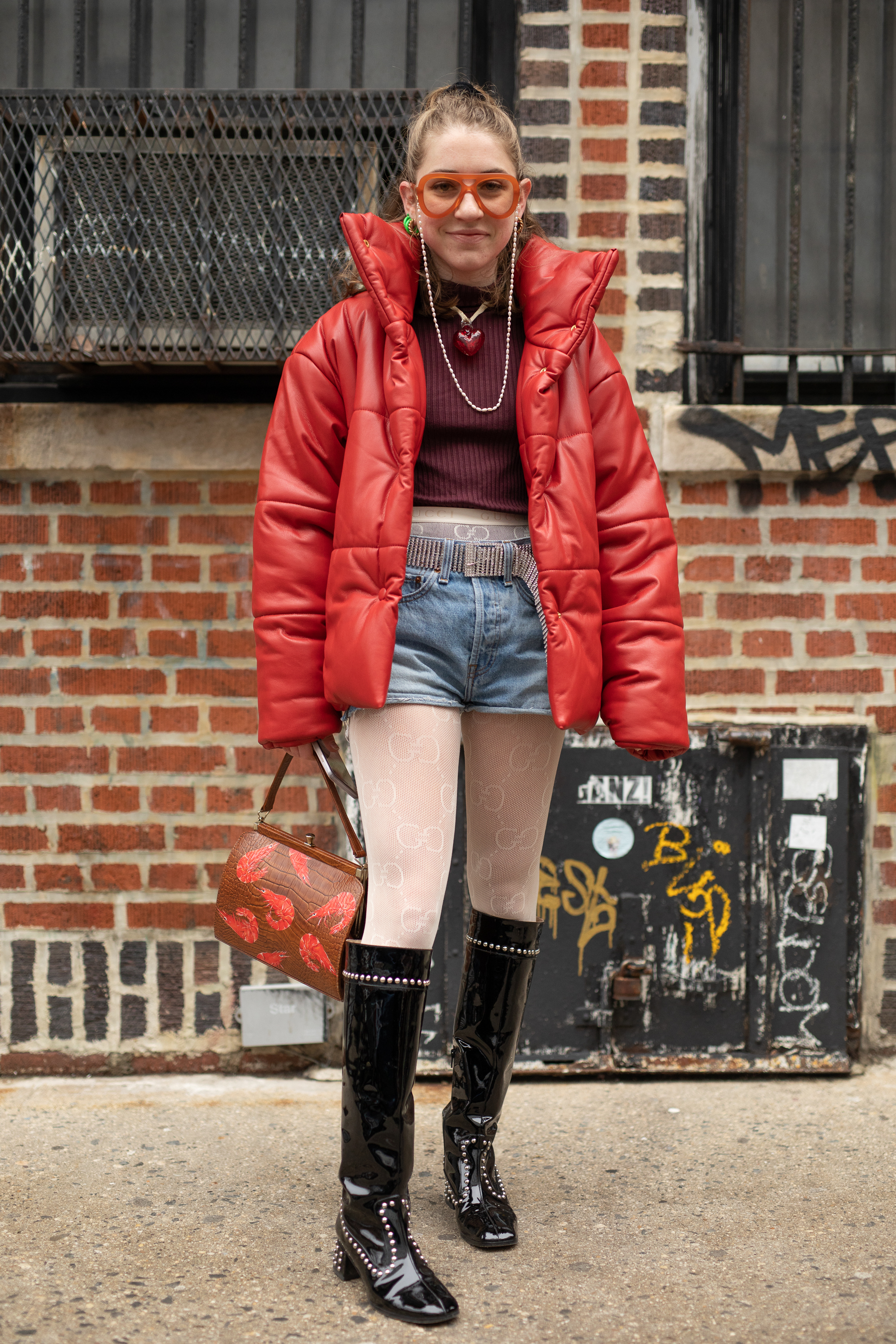 A guest is seen on the street during New York Fashion Week AW19 wearing red down coat, denim shorts, maroon sweater, black knee-high boots and prawn patten bag.