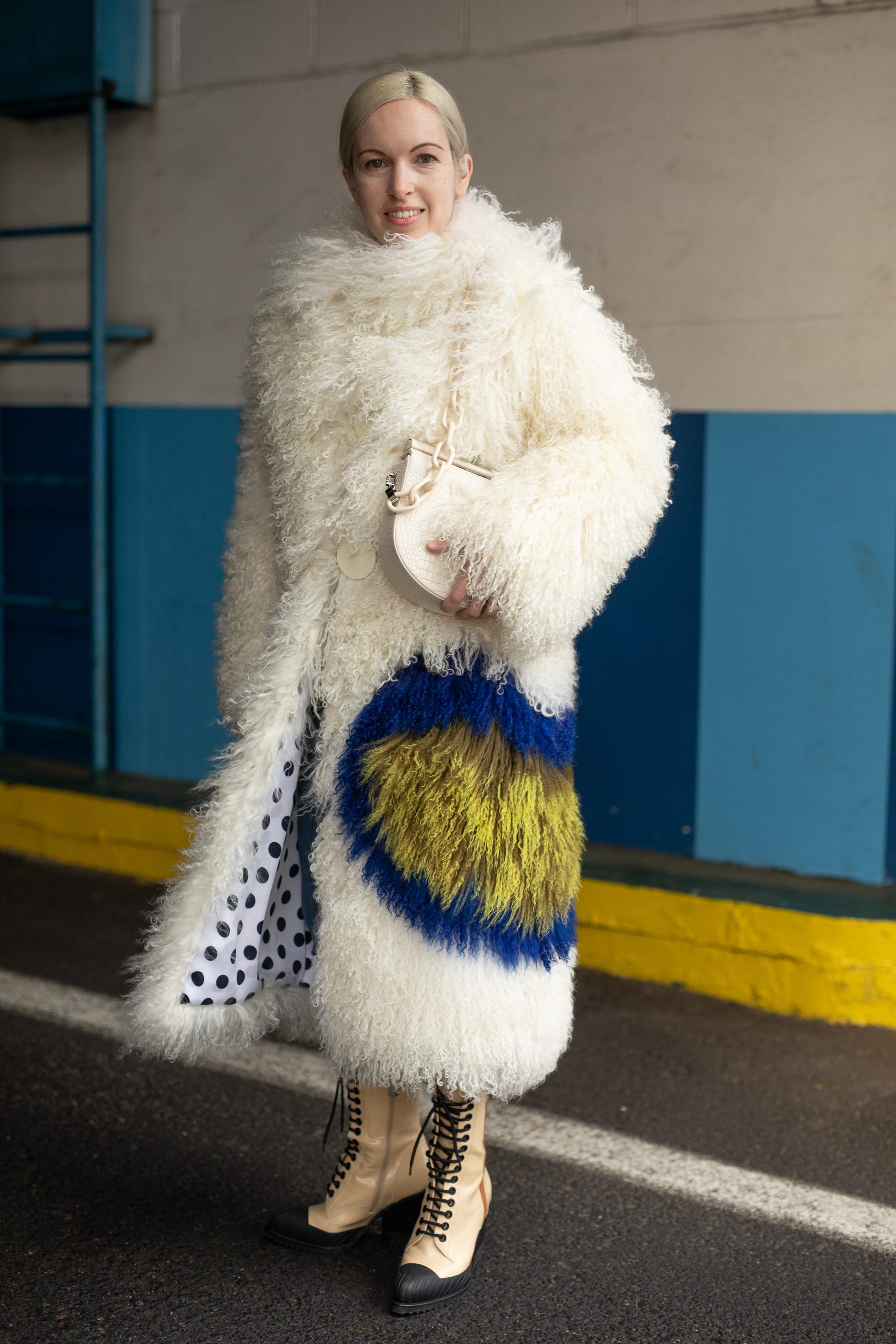 A guest is seen on the street during New York Fashion Week AW19 wearing white with blue/yellow design fur coat and taupe boots.
