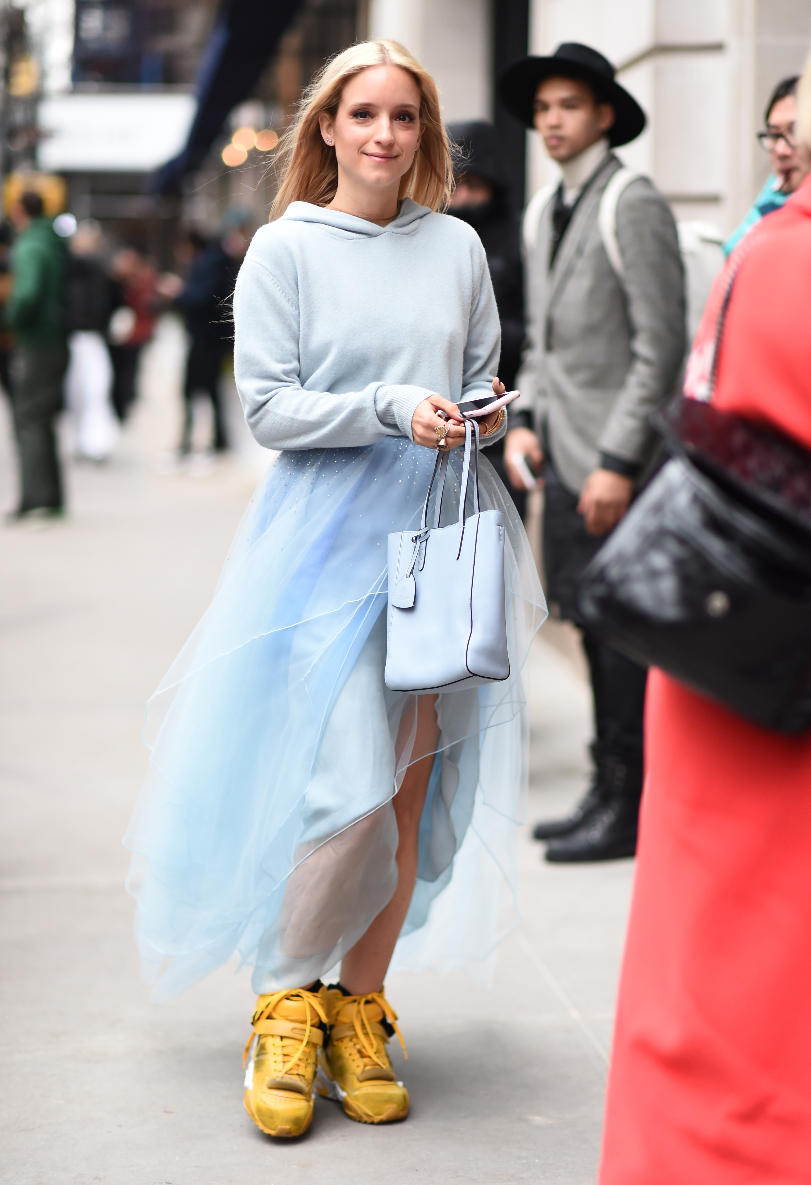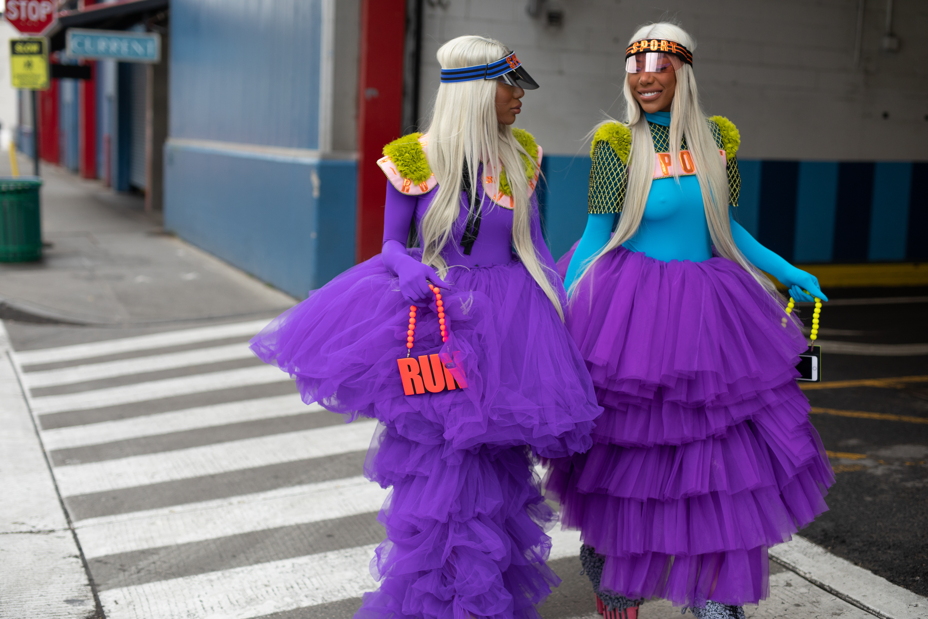 Guests are seen on the street during New York Fashion Week wearing purple tulle skirts with visors and RUN phone cases hand bags.
