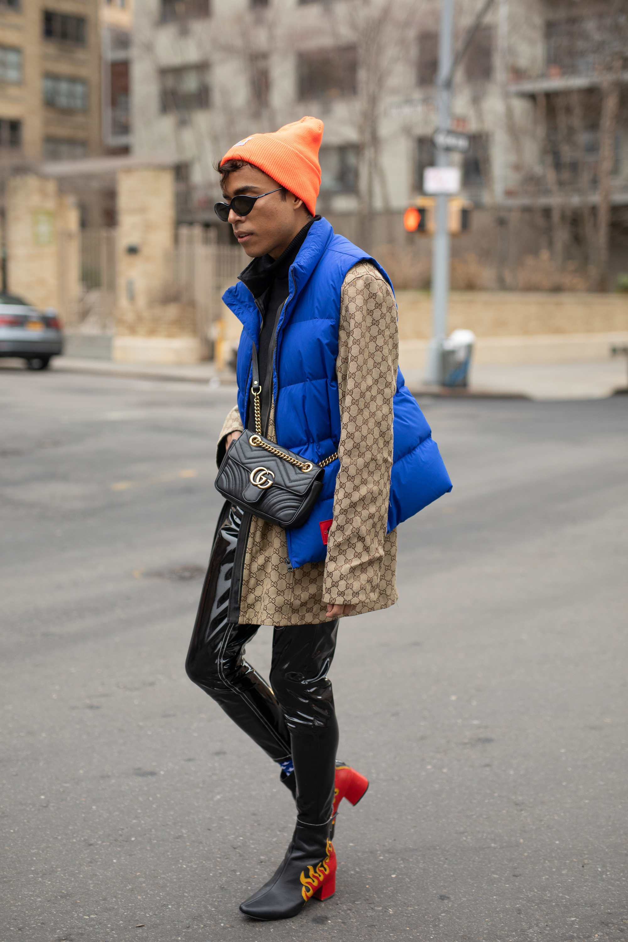 A guest is seen on the street during New York Fashion Week AW19 wearing blue down vest, taupe shirt, black bag and orange hat.