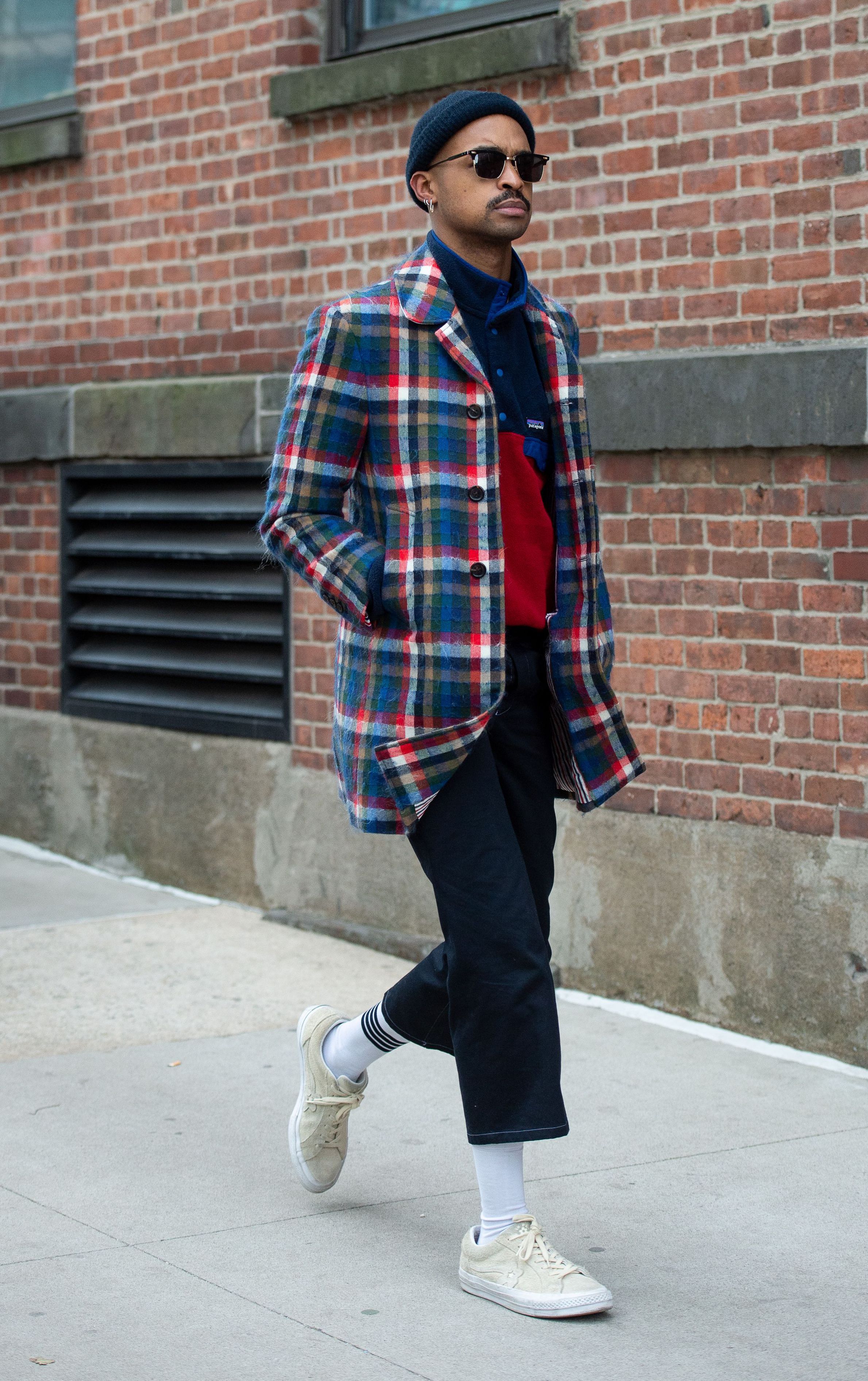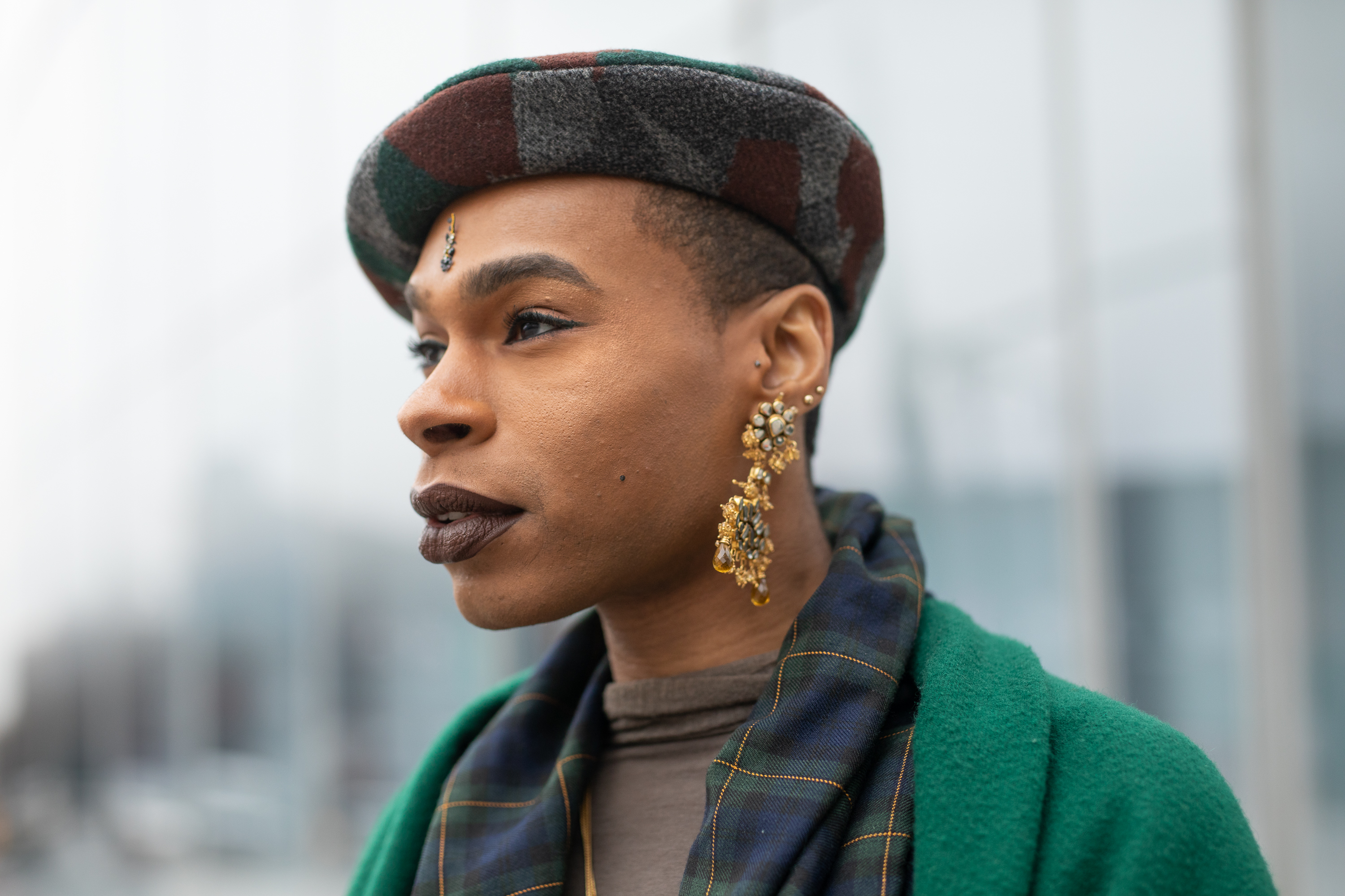 B. Hawk Snipes is seen on the street during New York Fashion Week AW19 wearing green wool scarf, plaid navy outfit, beret and gold earrings.